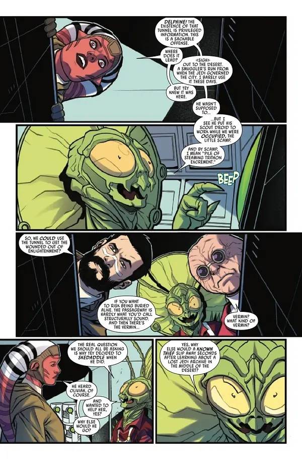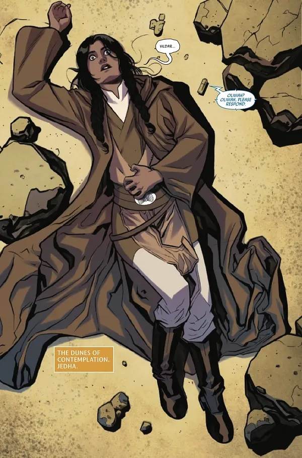 The High Republic, Phase II, #8 begins with Jedi Knight Oliviah Zeveron (I’m still curious about her sharing a last name with the leader– The Mother, to be specific– of the Path of the Open Hand) clinging to life in the Dunes of Contemplation outside Jedha City.