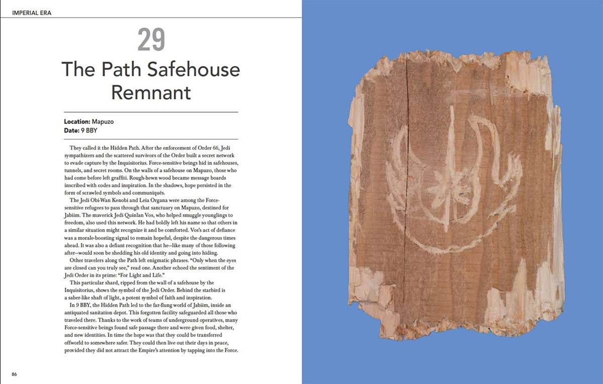With that in mind, I want to note that Baver chose the perfect artifact with which to kick off this book– the multi-paneled bas-relief of the Great Sith Wars that once hung in Supreme Chancellor Palpatine’s office in Star Wars: Revenge of the Sith. This item is of particular interest to me as a fan of Star Wars: Galaxy’s Edge, because the antiquarian Ithorian character called Dok-Ondar has a very similar-looking one hanging in his shop in Black Spire Outpost on the planet Batuu. And while Baver doesn’t mention Dok by name, she does add a footnote that “similar bas-reliefs have been found at the excavation sites of Sith and Jedi temples," perfectly filling in the blanks for me as to why the Ithorian would have one in his collection. That’s the kind of world-building I really appreciate when it comes to filling in the gaps of the vast tapestry we call Star Wars, and the trend continues with further objects like Jedi Master Plo Koon’s Antiox Mask, the Hand of the Lost King of Duro (as seen on display in Dryden Vos’s yacht in Solo: A Star Wars Story), a certain control knob from The Mandalorian’s ship the Razor Crest, and the Sith Wayfinder that Kylo Ren uses to track down the planet Exegol in The Rise of Skywalker.