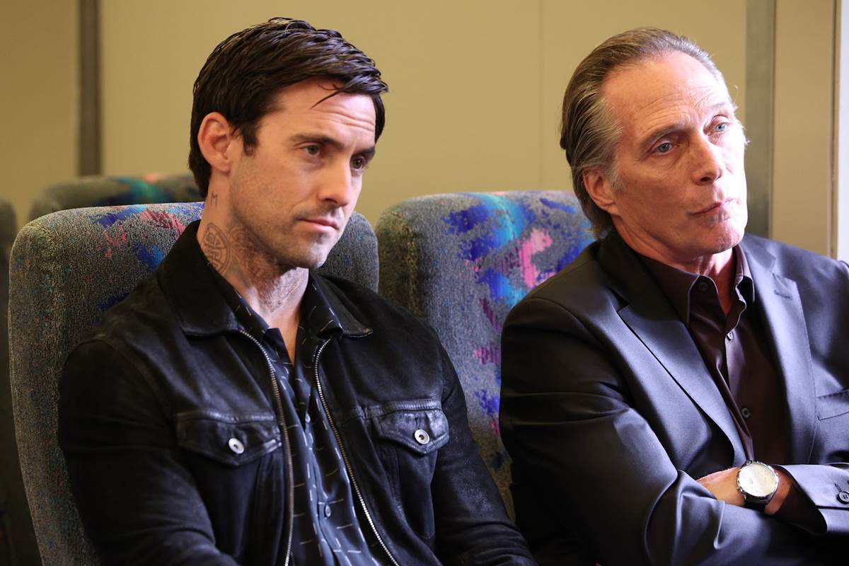 Now they move to the basement and plan on having two meetings at the same time. They’ll tell Daphne and Emma everything each needs to know, but only show Emma what they want her to see. Birdie points out they’ll need more bodies to pull this off. Leo (William Fichtner) talks with Simon who’s immediately in; Birdie will give him the details. Charlie tells Leo there’s a problem, the meeting is happening on the metro. They’ll have to pull off The Two Jeffs on a train.
