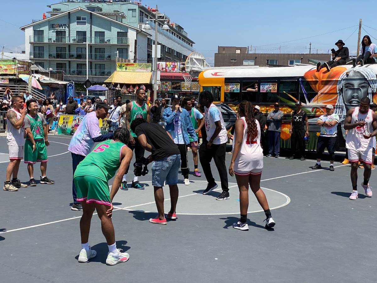 Once the afternoon got going, activities included skills challenges, a dunk contest, and more. The director of this 2023 version of White Men Can’t Jump (which is a remake of the 1992 movie of the same name starring Wesley Snipes and Woody Harrelson), Calmatic, was soon on hand to participate in the outdoor fun and throw some hoops himself.