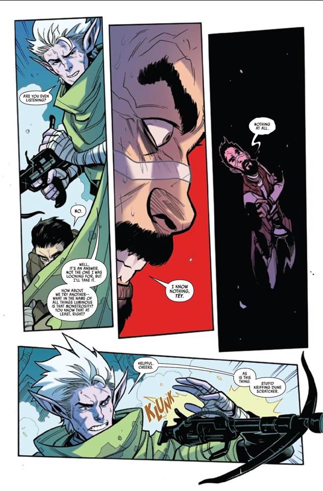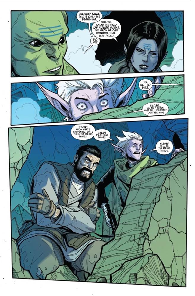 There, Jedi Master Leebon has been consumed by the fearsome, Force-eating creature called the Leveler at the command of the Herald of the Path of the Open Hand, Werth Plouth. Jedi Knight Vildar Mac and his ally (and former Guardian of the Whills) Tey Sirrek watch helplessly from the shadows as Leebon is turned to ash, and Vildar sinks into a pit of terror as a side effect of the Leveler’s powers against Force users. Soon the Herald is alerted to the presence of these two interlopers, and a battle begins between our heroes and the members of the Path. During the skirmish, Tey stumbles across a dark-side artifact known as the Hand of Siberus (though this is only identified by name on this issue’s cover and not in the interior of the comic), which grants him the ability to unleash pink-hued beams of electricity. This gives Sirrek an advantage over both the Path followers and the Leveler, the latter of which he kills in a fit of rage when it’s sicced on Vildar Mac. In turn, Path member Yana Ro (see Scott’s excellent young-adult novel Star Wars: The High Republic - Path of Vengeance for much more on her situation) evidently murders Tey Sirrek.