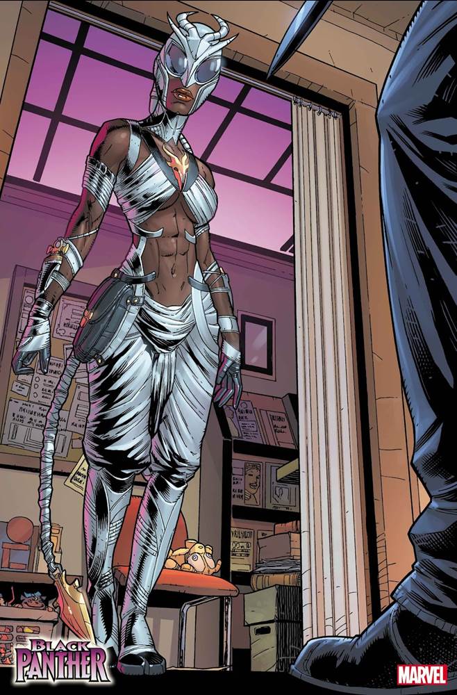 - In this special first look at “Black Panther #1," T’Challa observes the bustling city of Birnin T'Chaka from above, hiding in darkness. Donning a new costume, the Black Panther scans the city from the rooftops, looking for trouble. Then, T’Challa breaks into a high-speed chase throughout the streets of Birnin T'Chaka. In the last two pages of this preview, a new foe emerges to look for information and then disappears without a trace.