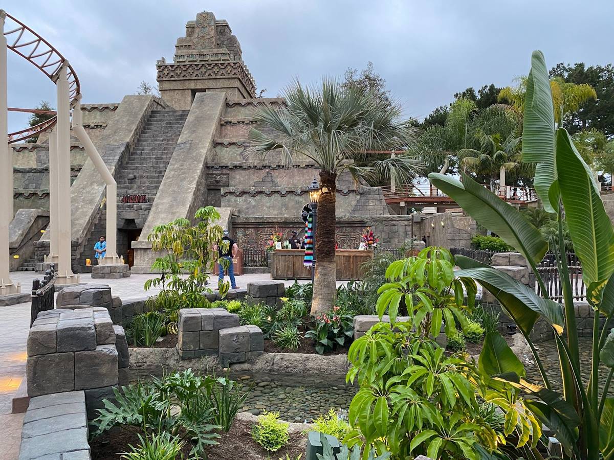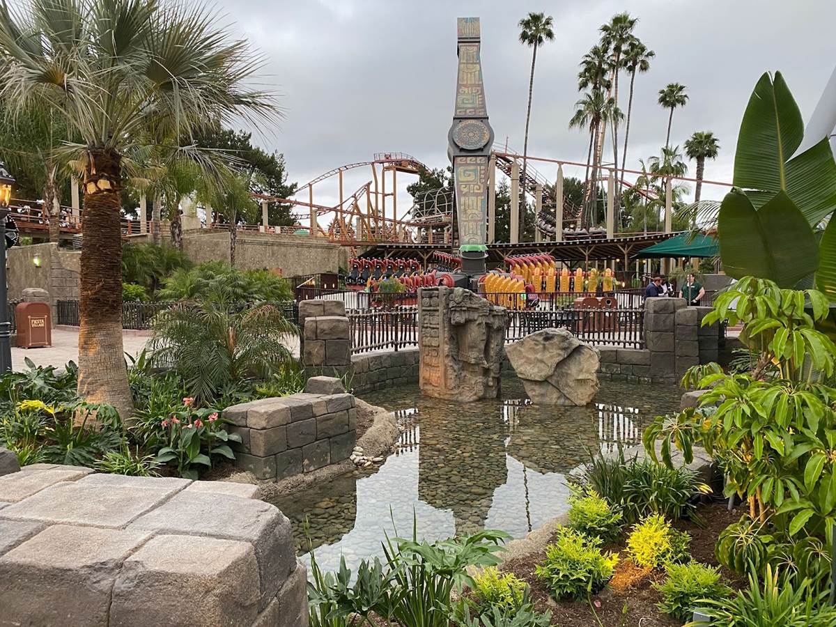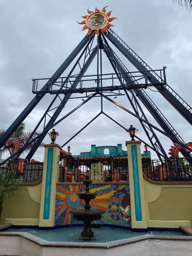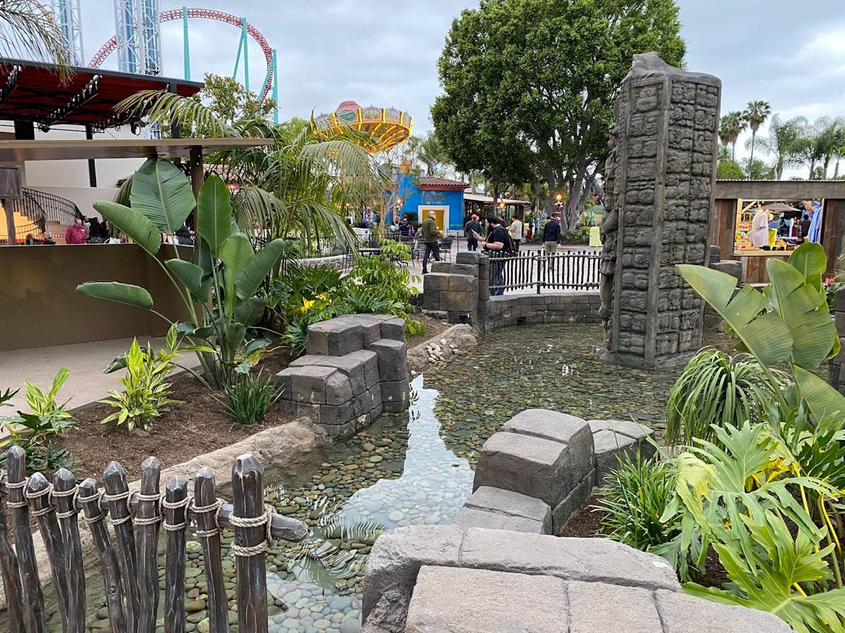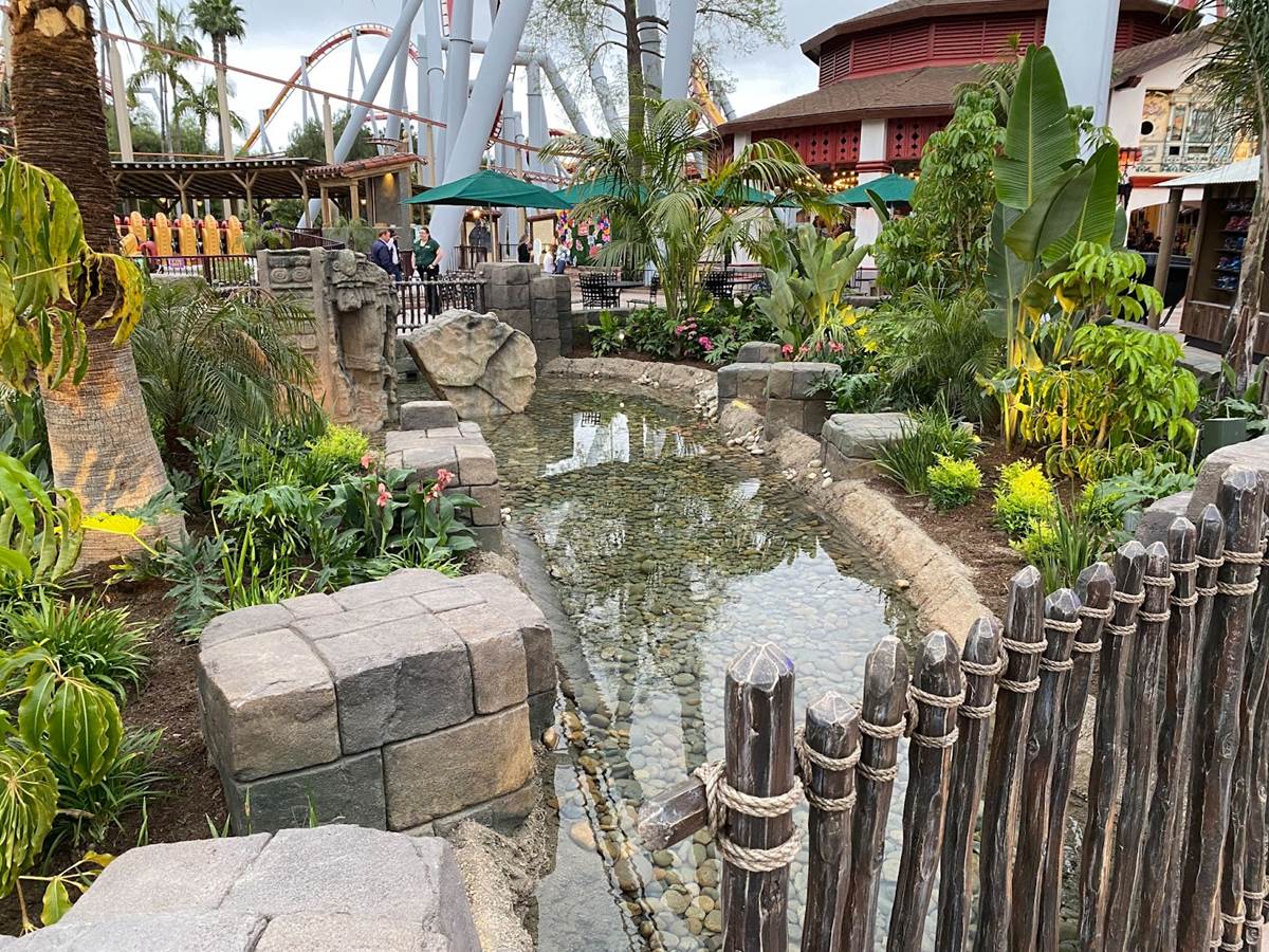But my absolute favorite part of the Fiesta Village makeover has to be the area right in front of the Jaguar roller coaster. This section has been decked out with a gorgeous new water feature, a lovely themed bridge, and some super neat-looking Aztec ruins.