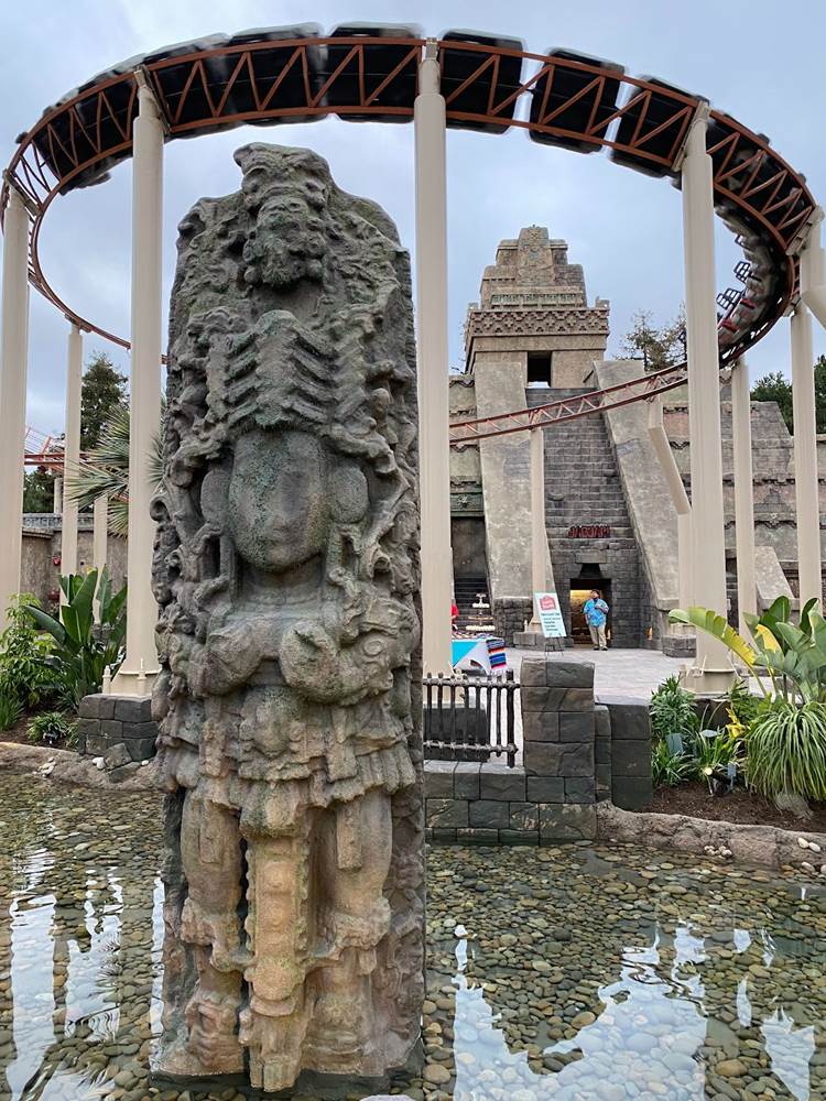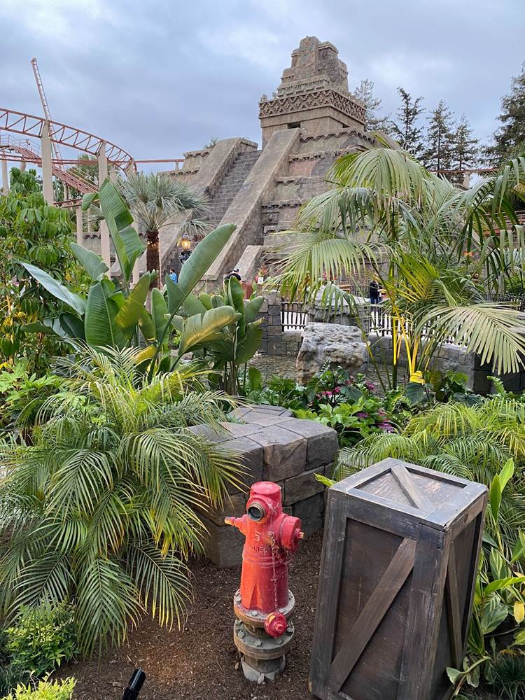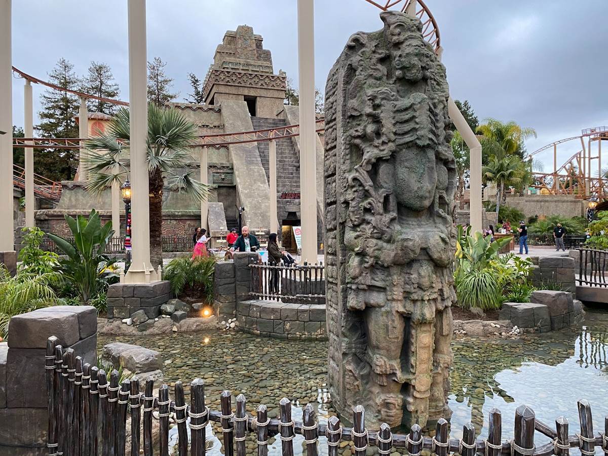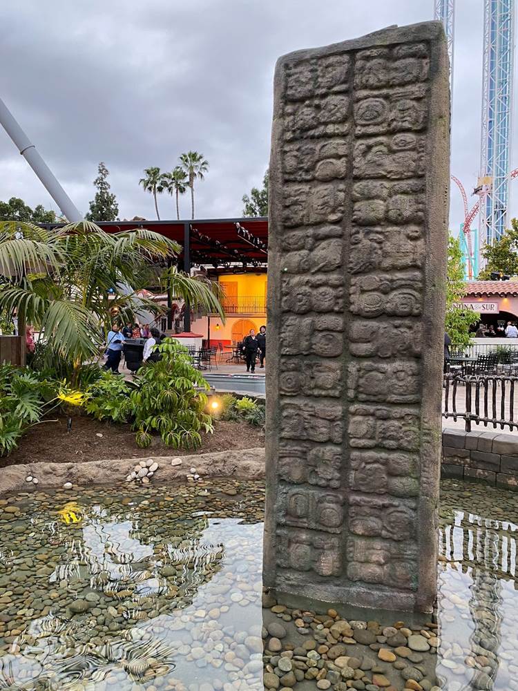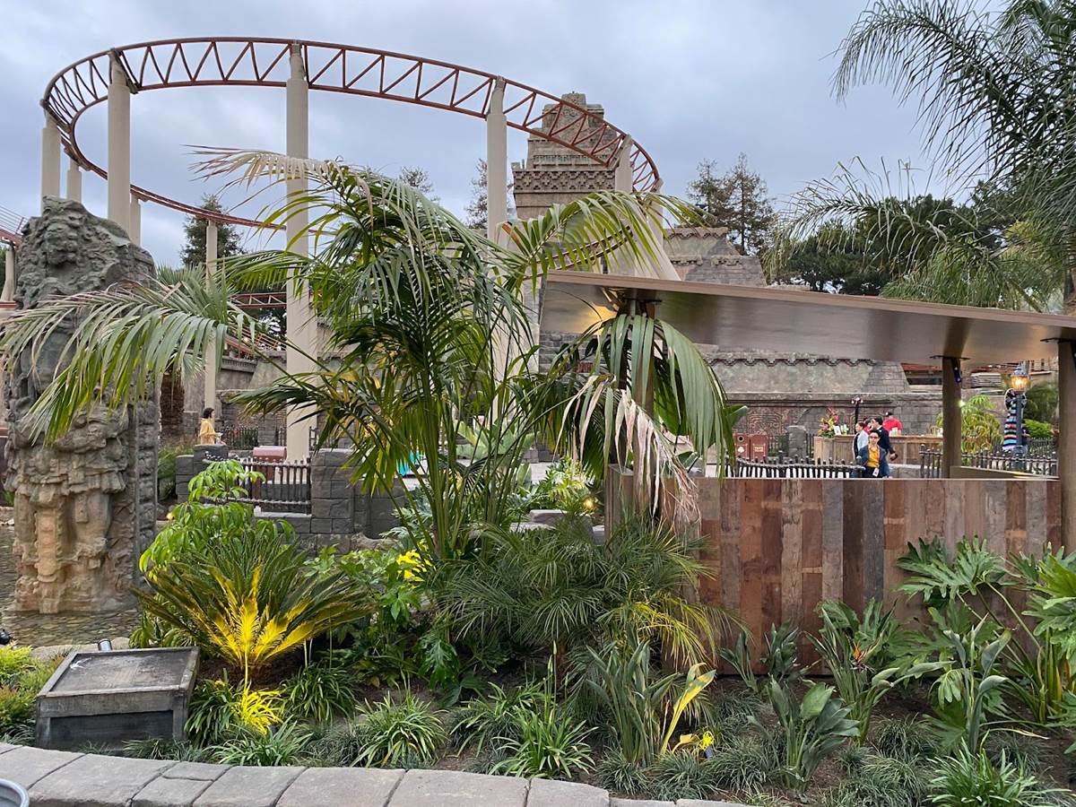 But my absolute favorite part of the Fiesta Village makeover has to be the area right in front of the Jaguar roller coaster. This section has been decked out with a gorgeous new water feature, a lovely themed bridge, and some super neat-looking Aztec ruins.