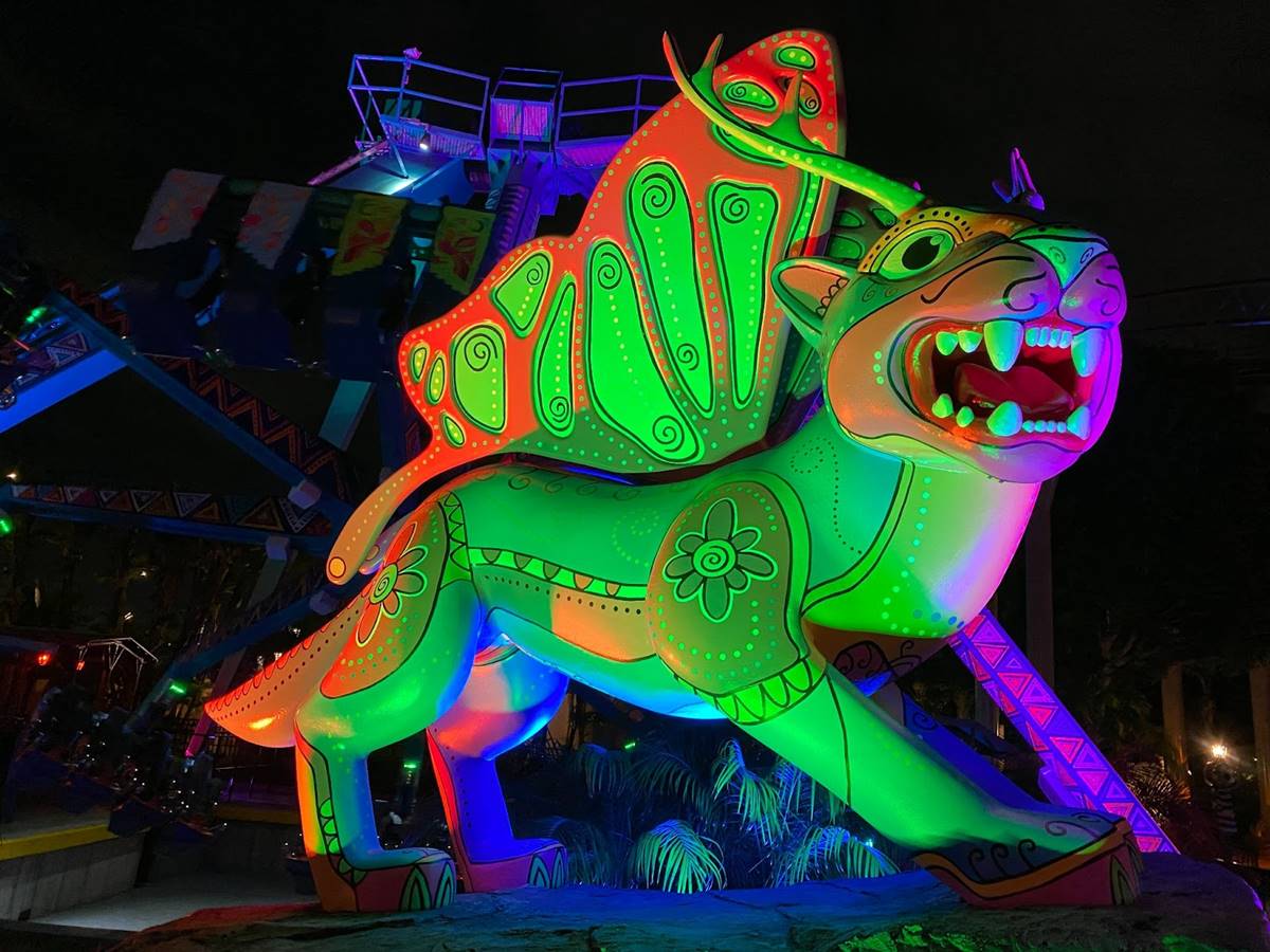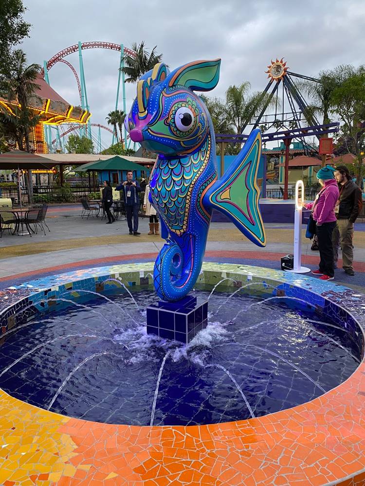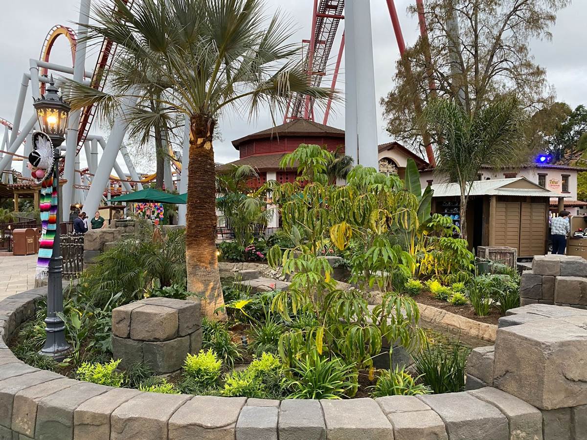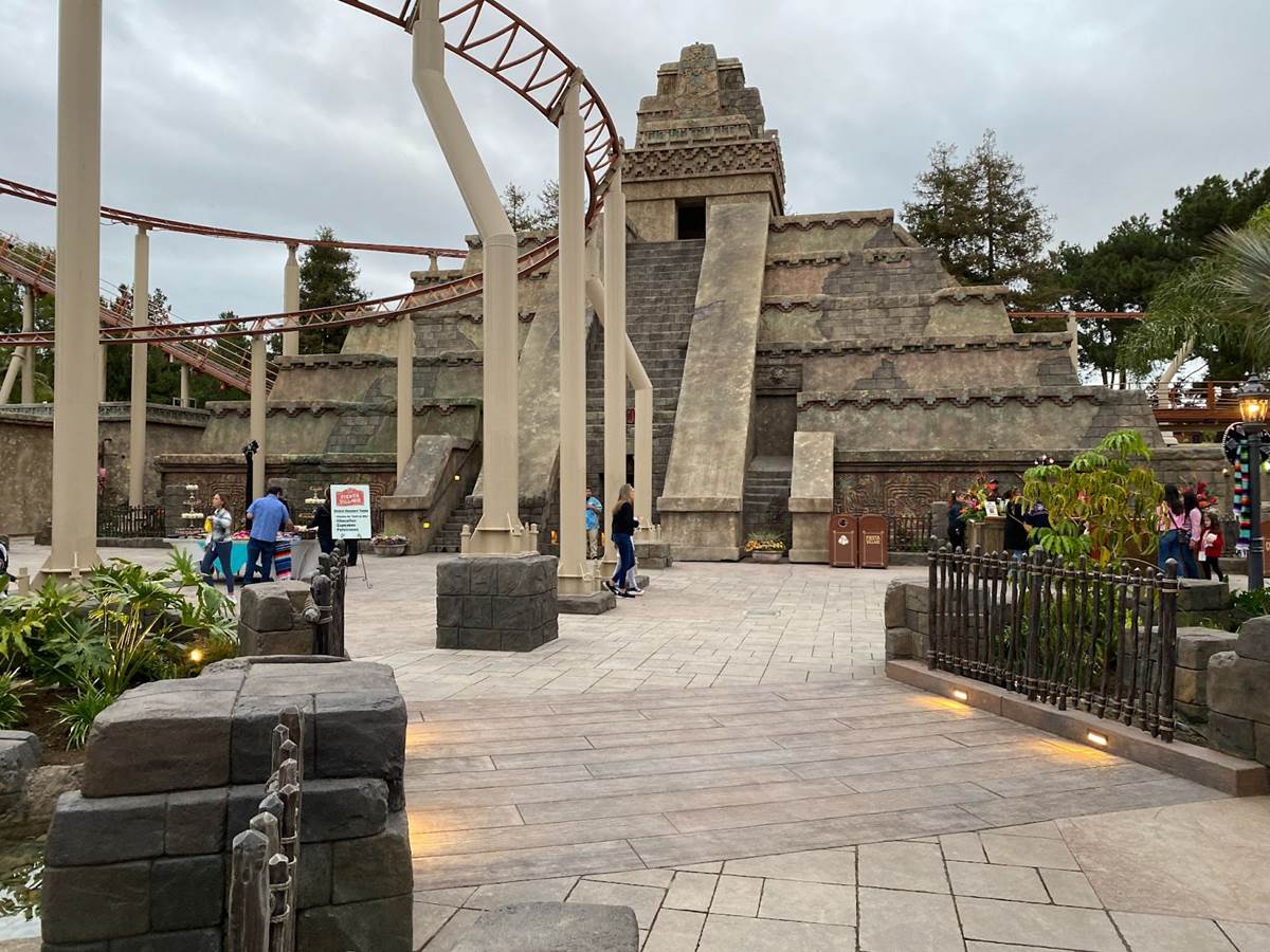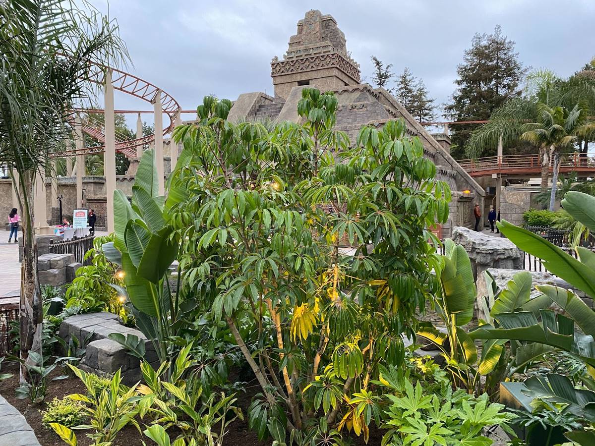 But my absolute favorite part of the Fiesta Village makeover has to be the area right in front of the Jaguar roller coaster. This section has been decked out with a gorgeous new water feature, a lovely themed bridge, and some super neat-looking Aztec ruins.