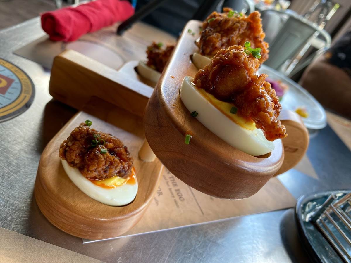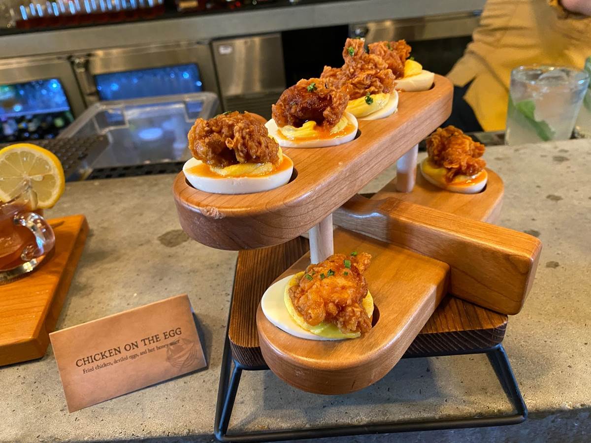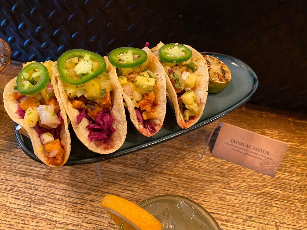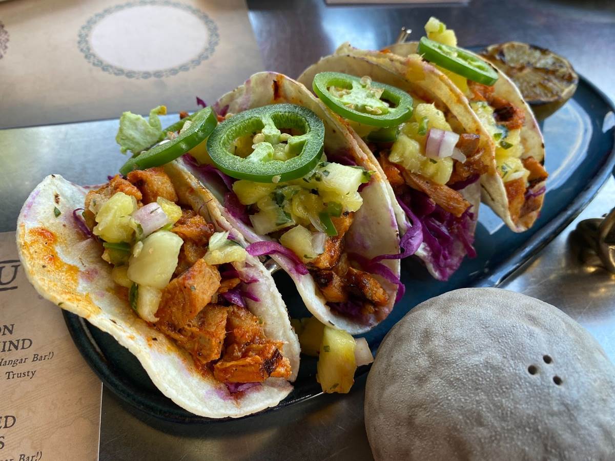 During our visit to Jock Lindsey’s Hangar Bar today, we got to try out some of the new menu items, which are all delicious and inventive (some of them are even gluten-free as well, which was perfect for me). Check out the up-close photos of the Tacos Al Pastor, the Chicken On the Egg, the Giant Bacon for All Mankind, and the Marche Stuffed Dates and Figs below.