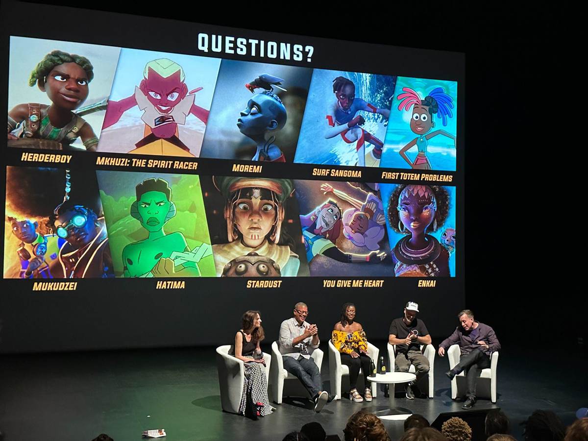 Tendayi, Anthony, and Peter gave brief overviews of seven shorts, sharing some interesting facts about each. The whistle you’ll hear in “Herderboy" was inspired by an actual cattle call in Uganda. The neighborhood setting of “Mkhuzi: The Spirit Racer" was inspired by the streets that director Simangaliso ‘Panda’ Sibaya grew up on in Soweto, South Africa. “First Totem Problems" comes from Egypt and is the directorial debut of Tshepo, who has been writing and producing TV up until now. “Mukudzei" follows a teenager who faces consequences after vandalizing a historical monument, one that actually exists in Zimbabwe. Director Pious Nyenyewa also provides the voice of the short’s title character and was heavily inspired by Blade Runner. “Hatima" is the end result of two separate projects pitched by directors Terence Maluleke and Isaac Mogajane, who the producers paired. “Stardust" is a collaboration with Egypt-based studio Giraffix. And for “You Give Me Heart," Tendaya shared that all but one of the shorts had their sound design and score created within Africa.