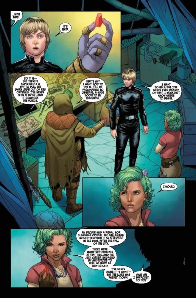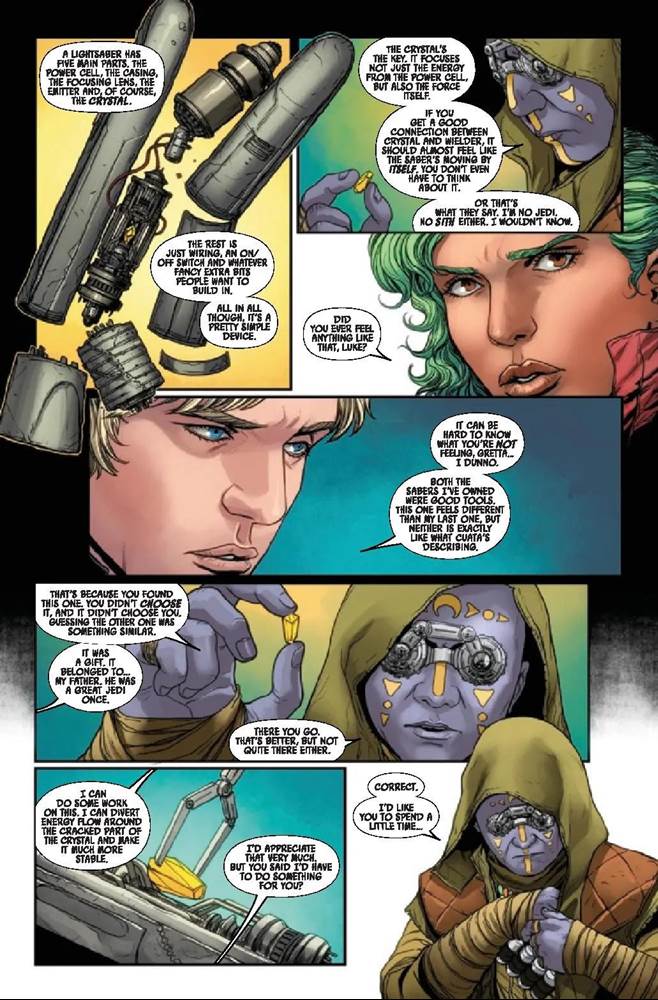 Star Wars #35 begins where the previous issue left off, with Luke having met the enigmatic Cuata (first mentioned in the Rogue One: A Star Wars Story novelization), a scientist researching Kyber crystals and lightsabers. Cuata claims to be able to hear the crystals speaking to him, and the woman named Gretta who brought Luke to meet him explains that spending too much time around Kyber can mess with one’s mind. Anyway, Luke wants Cuata to fix the yellow lightsaber he’s been using recently, and the Pantoran discovers that its crystal is cracked, so he sets to work on repairing it. But in exchange, he wants Luke to meditate using the Force and subconsciously engage with two separate Kyber crystals– one red and one clear– basically just to see what happens. For the red crystal, which Luke is ostensibly meant to free from its dark-side prison, Luke sees a vision of what appears to be an ancient Sith Lord, followed by an encounter with his own father, Darth Vader. Then, once inside the clear crystal, Luke has an entire conversation with Yoda, and eventually wakes up to find that he’s turned the crystal he’s holding green.