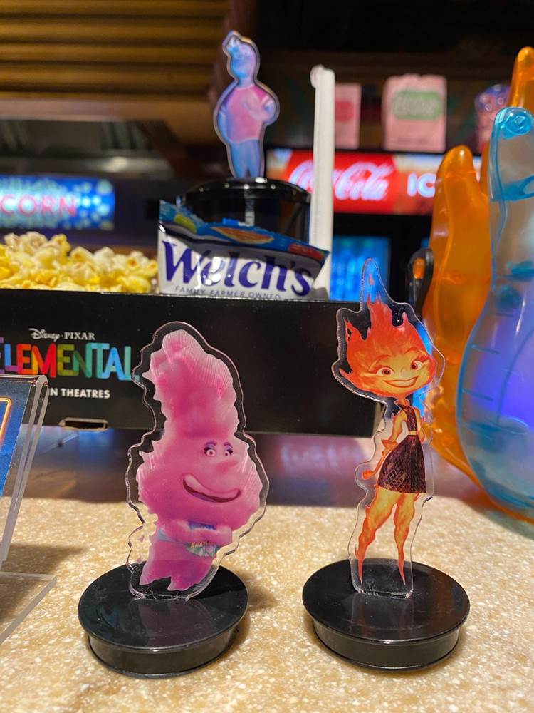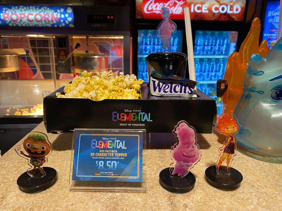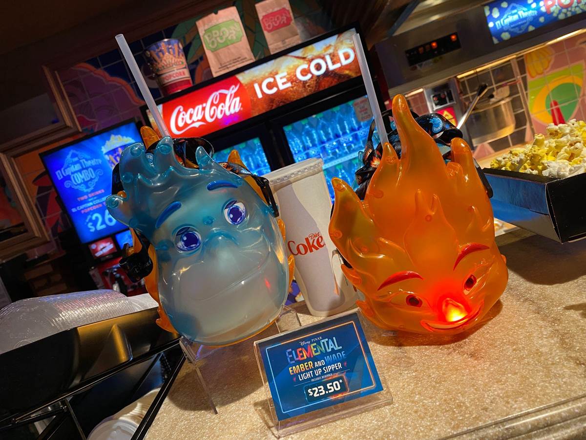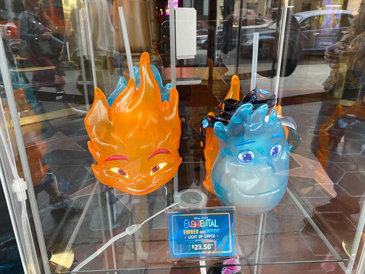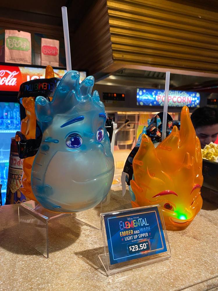 Over at the concession stand, attendees can grab an extremely cool two-sided, light-up Elemental sipper depicting the lead characters of Ember and Wade, while kids’ packs with various character toppers are also available. These items were also on display in a glass case outside the theater.