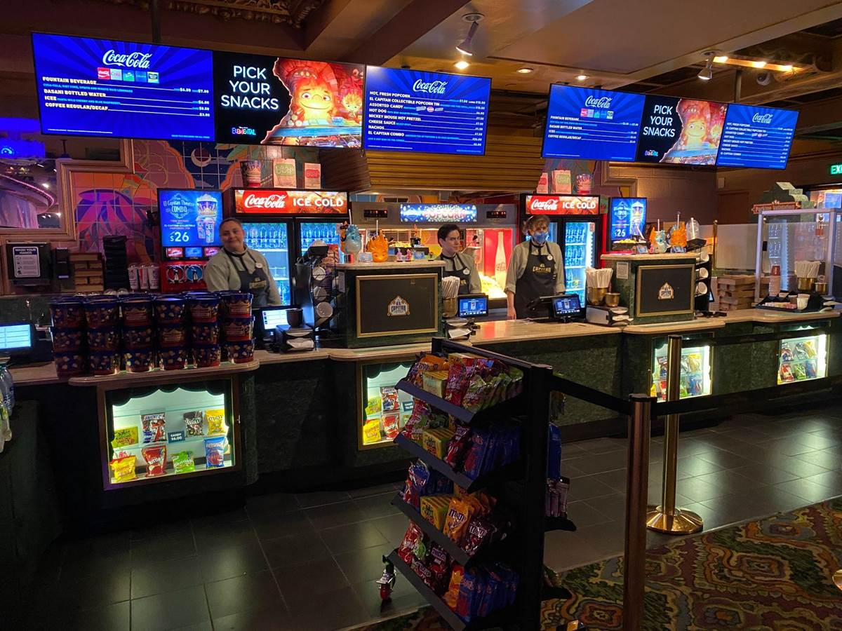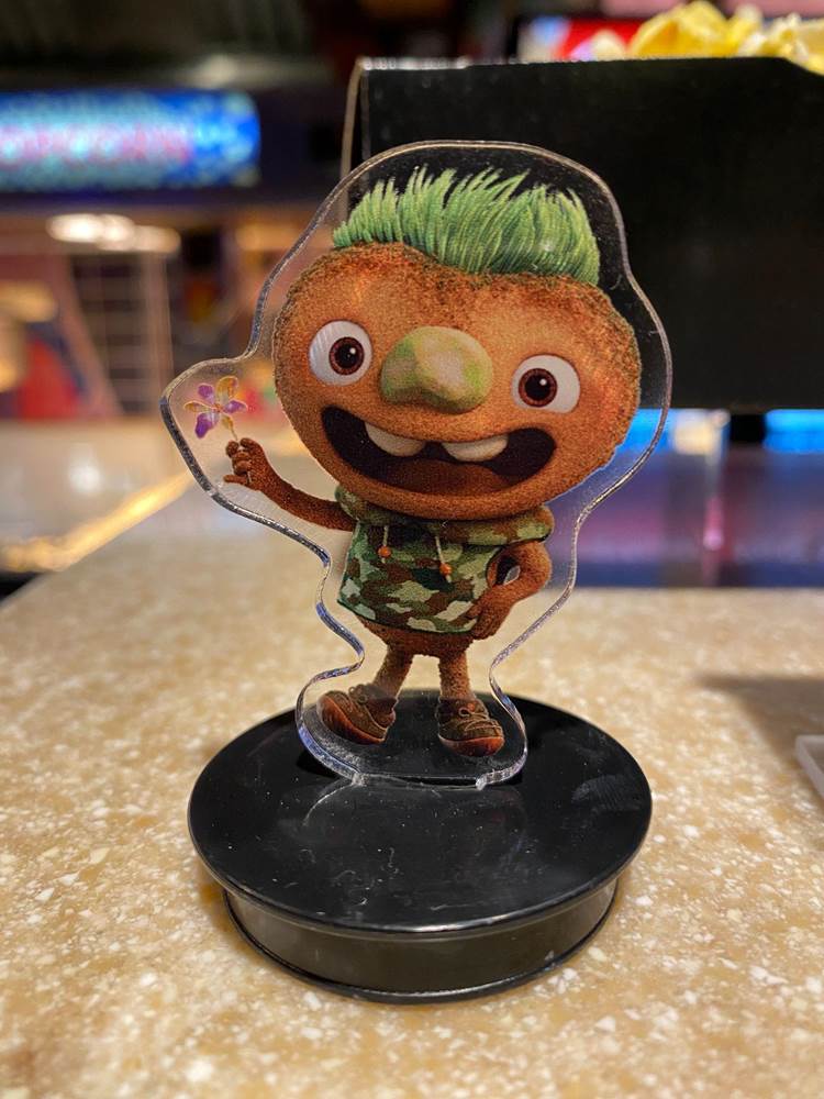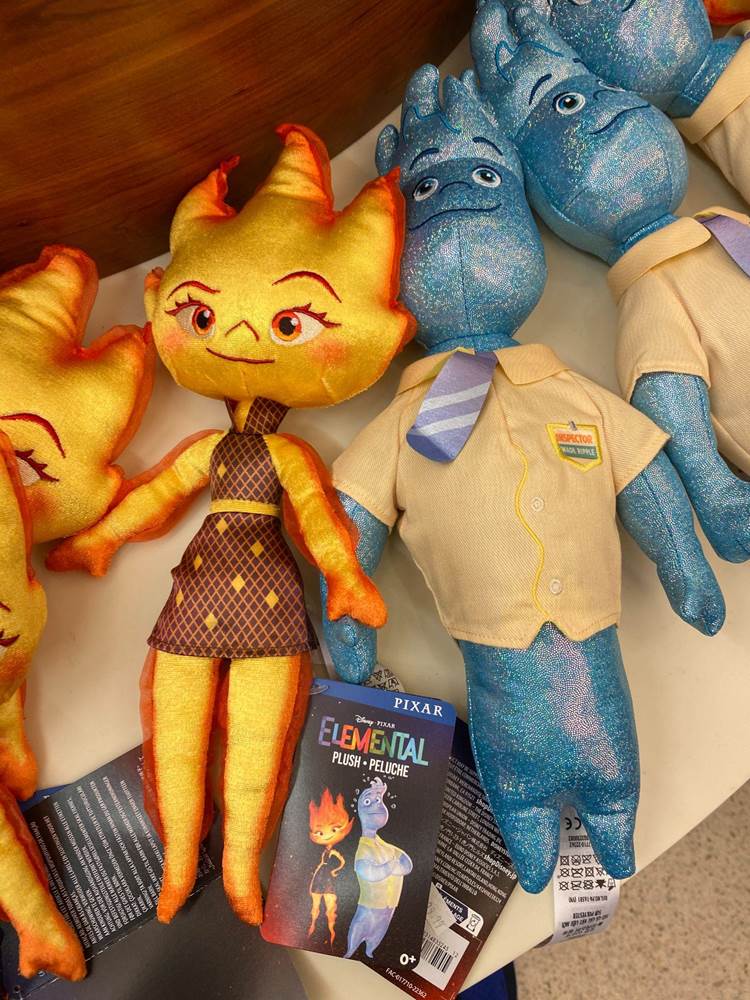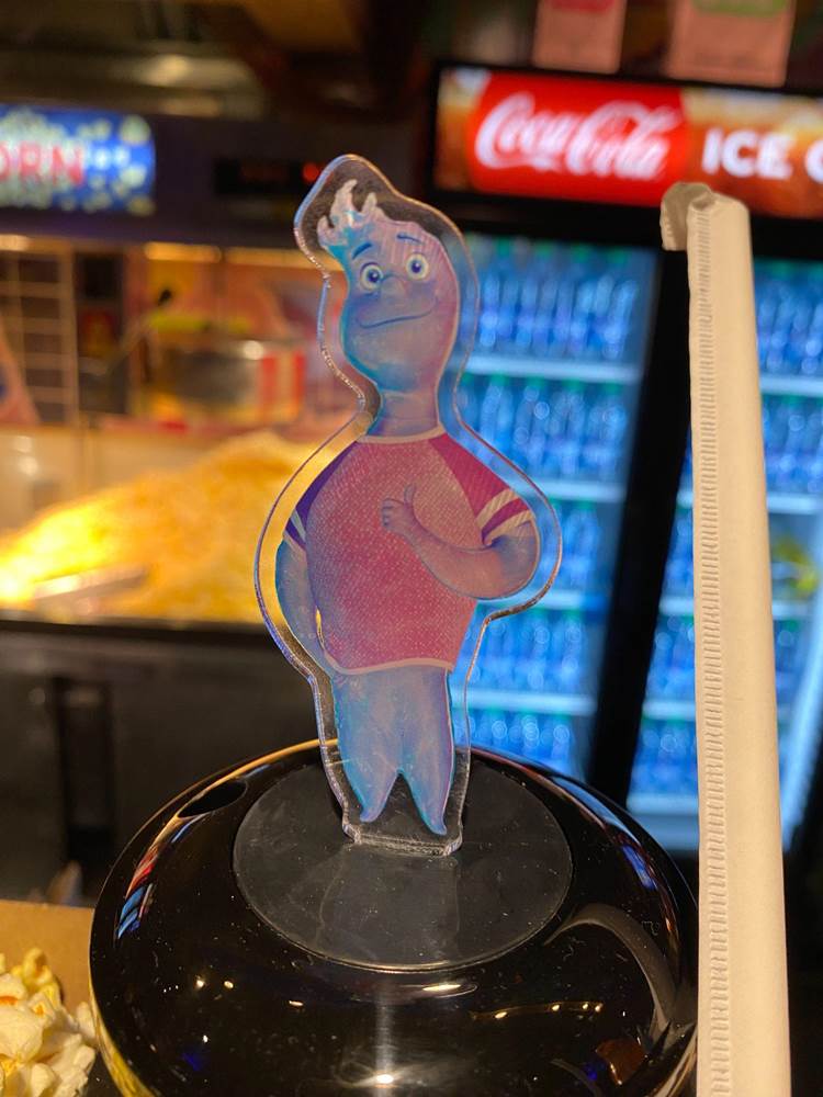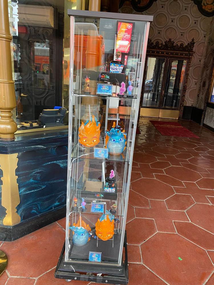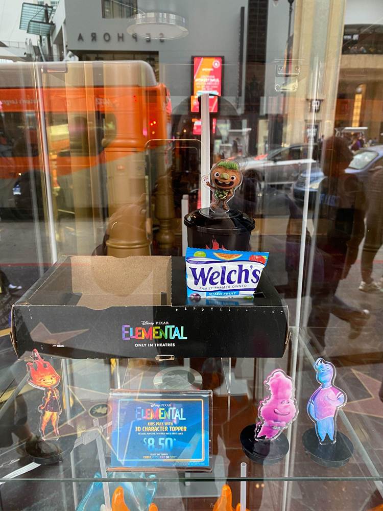 Over at the concession stand, attendees can grab an extremely cool two-sided, light-up Elemental sipper depicting the lead characters of Ember and Wade, while kids’ packs with various character toppers are also available. These items were also on display in a glass case outside the theater.
