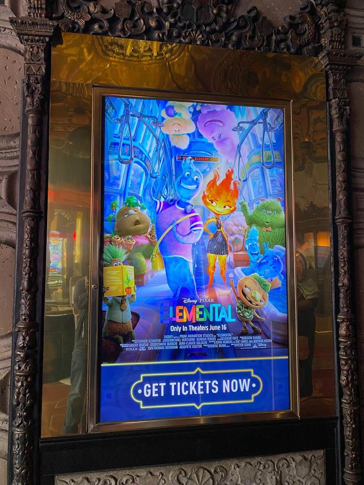 Arriving at the historic El Capitan, guests will find the theater entrance and its marquee decked out with the poster and key art for Pixar’s Elemental.