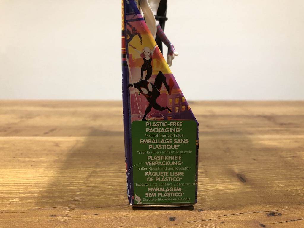 One trend I’ve recently seen across several Hasbro toy lines is the move away from plastic packaging. This figure is attached to a cardboard card with a boxy bottom so that it can stand on its own or hang from a display rack. She’s secured to the box with paper twist ties instead of plastic ties or bands. The packaging also features the hexagon Spider-Verse portal behind her and Spider-Man 2099 and Miles Morales join her as they swing through the city.
