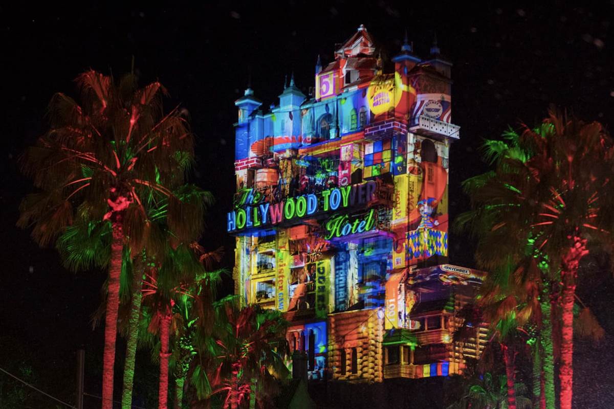 The Sunset Seasons show will illuminate the Hollywood Tower with holiday scenes, featuring laser effects and projections of favorite characters