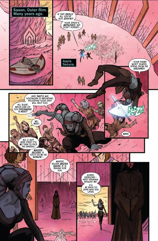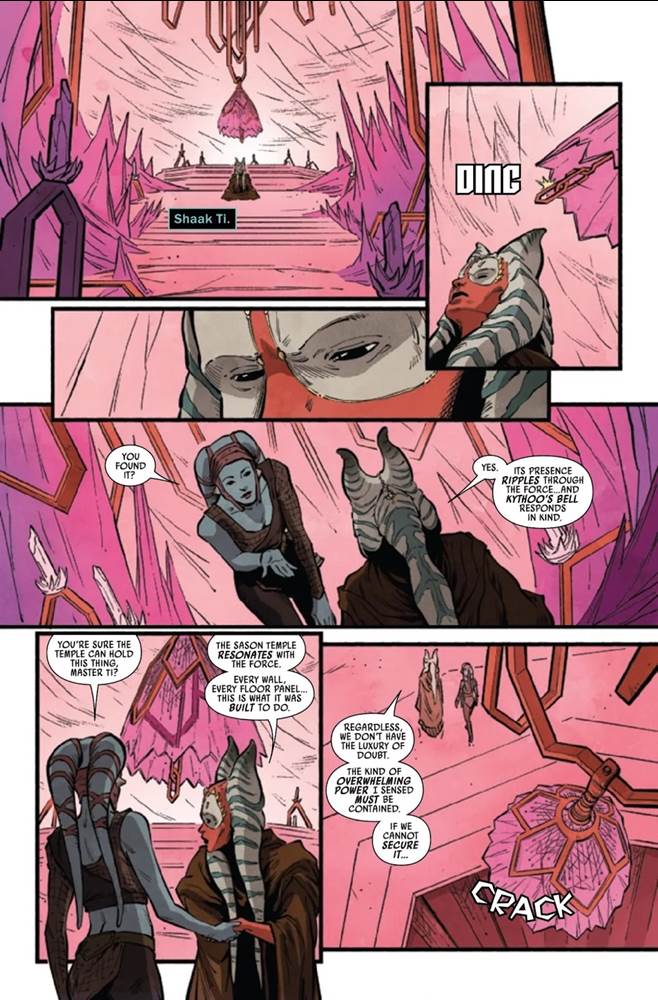 Doctor Aphra, Volume II, #33 begins with a flashback to “many years ago" in the Sason temple on the galaxy’s Outer Rim. Jedi Masters Aayla Secura and Shaak Ti train Padawans there, and worry that Kythoo’s Bell might be too powerful for the temple to hold. Cut to the “present" of this comic (set between the events of The Empire Strikes Back and Return of the Jedi), where Aphra and Skywalker have arrived at that same temple to find holographic illusions of Aayla and Shaak greeting them upon falling into an underground chamber. As the two explorers begin to make their way around the interior of the temple, they gradually discover more about its nature– it’s made of resonant crystal (but not Kyber) and it’s capable of tricking them into going at each other’s throats. There’s also a familiar-looking monster seemingly being held prisoner within its walls, but they’ll find out more about that at the end of this issue. First it’s time for another flashback, where Secura and Ti warn the Padawans about the sound echoing throughout the temple, and what they need to do if it ever stops.