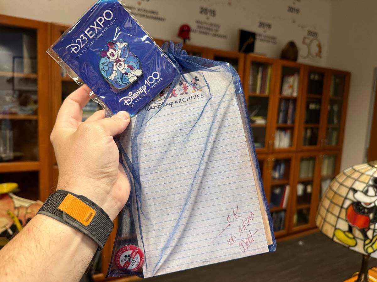 We didn’t leave The Walt Disney Archives empty-handed. Becky Cline passed out gift bags containing a notepad (complete with Walt Disney’s approval on whatever you write), a pencil, and a button that commemorates the visit. We also received a very special pin that is considered the first piece of Disney100 merchandise. It was created for the D23 Expo as a giveaway to attendees of the Disney Legends Ceremony. There were enough leftovers for everyone on our tour to receive one.