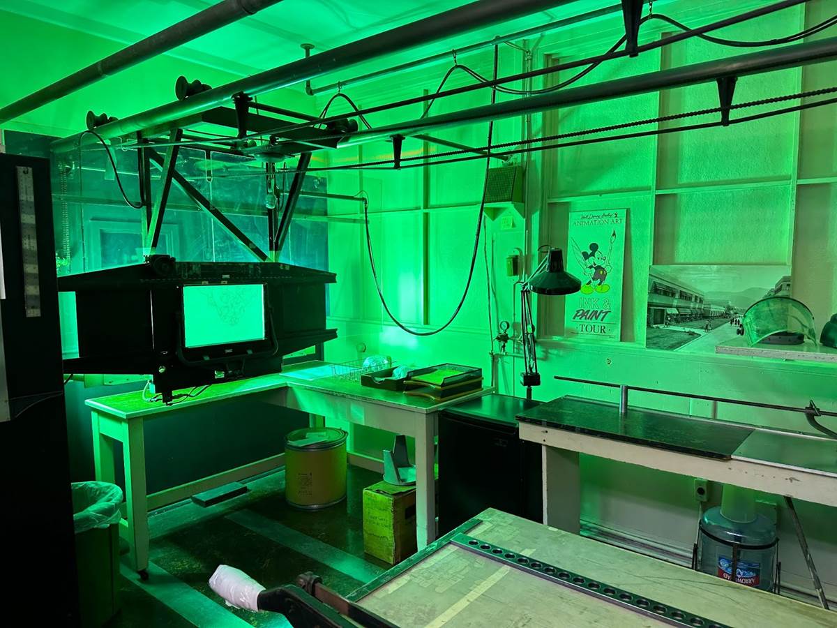 The traditional inking process was discontinued on 101 Dalmatians when the Xerox process was implemented to transfer the animator’s drawings onto celluloid. Each Xerox machine required three rooms to transfer, trimming down a process that took hours per frame into just a few minutes. Only one of the machines is still in the building, and it still works! We were shown how an image is captured, transferred to a plate, and then pressed onto a cel before being cured and sent to be painted. Like the hand-inked Tinker Bell, the Xerox process is still in use on select art created by the department for sale.