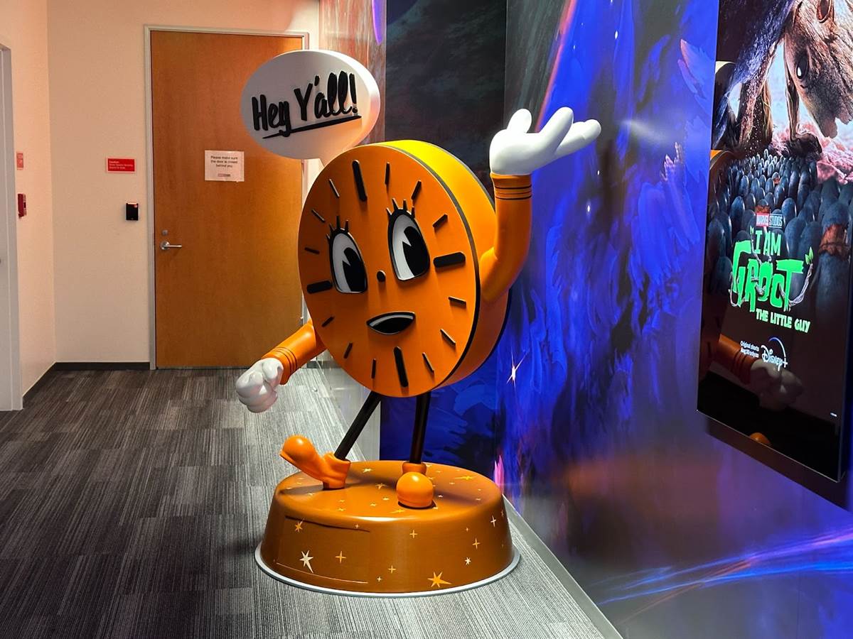 Before leaving the animation studio, we were shown a few areas of the first two floors, including the coffee bar named The Caffeine Patch after a gag in Meet the Robinsons. That area on the second floor also has a neon homage to the old Hyperion Studio and a standee celebrating the studio’s 100th anniversary. Click here to see more images from the studio’s display for their upcoming film, Wish.