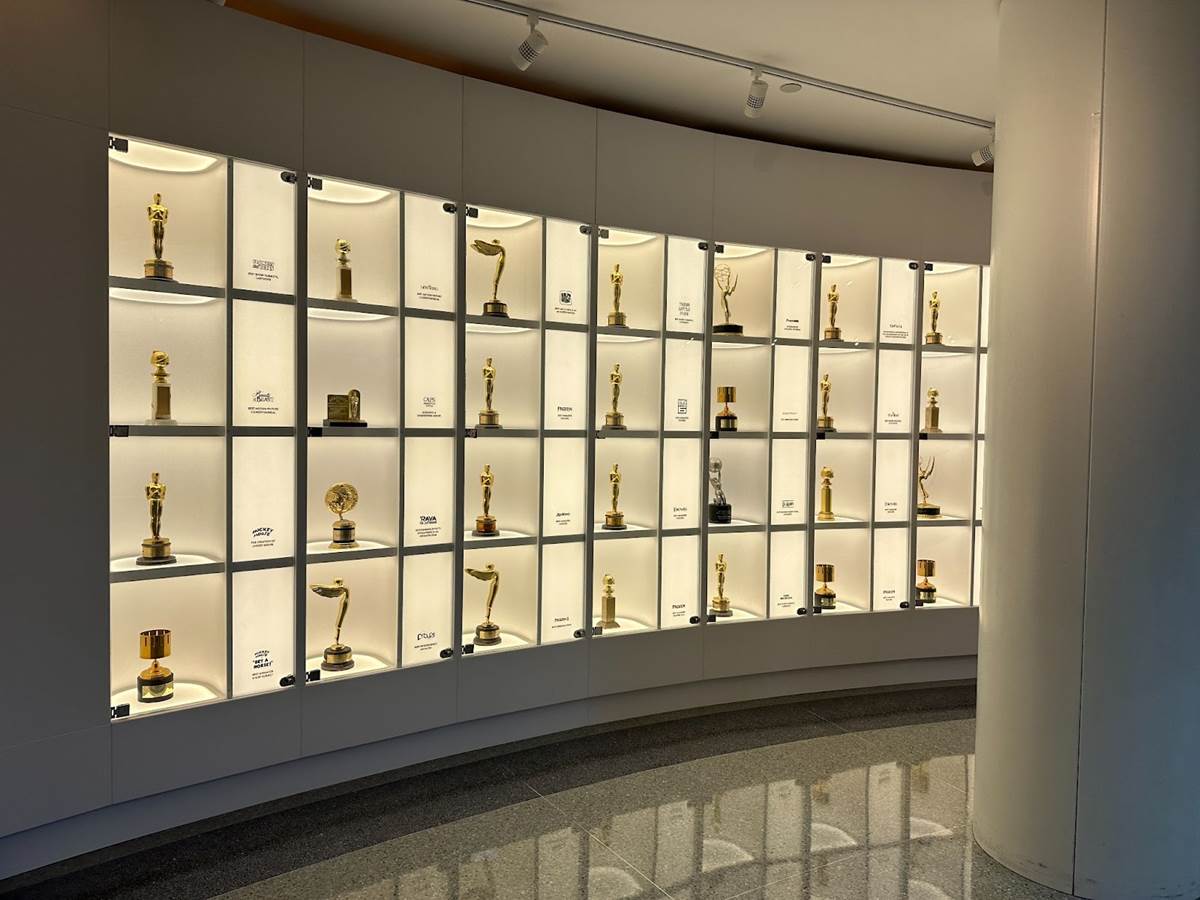 The main entrance hallways are themed to the studio’s 100th anniversary with a timeline of milestones on both sides.