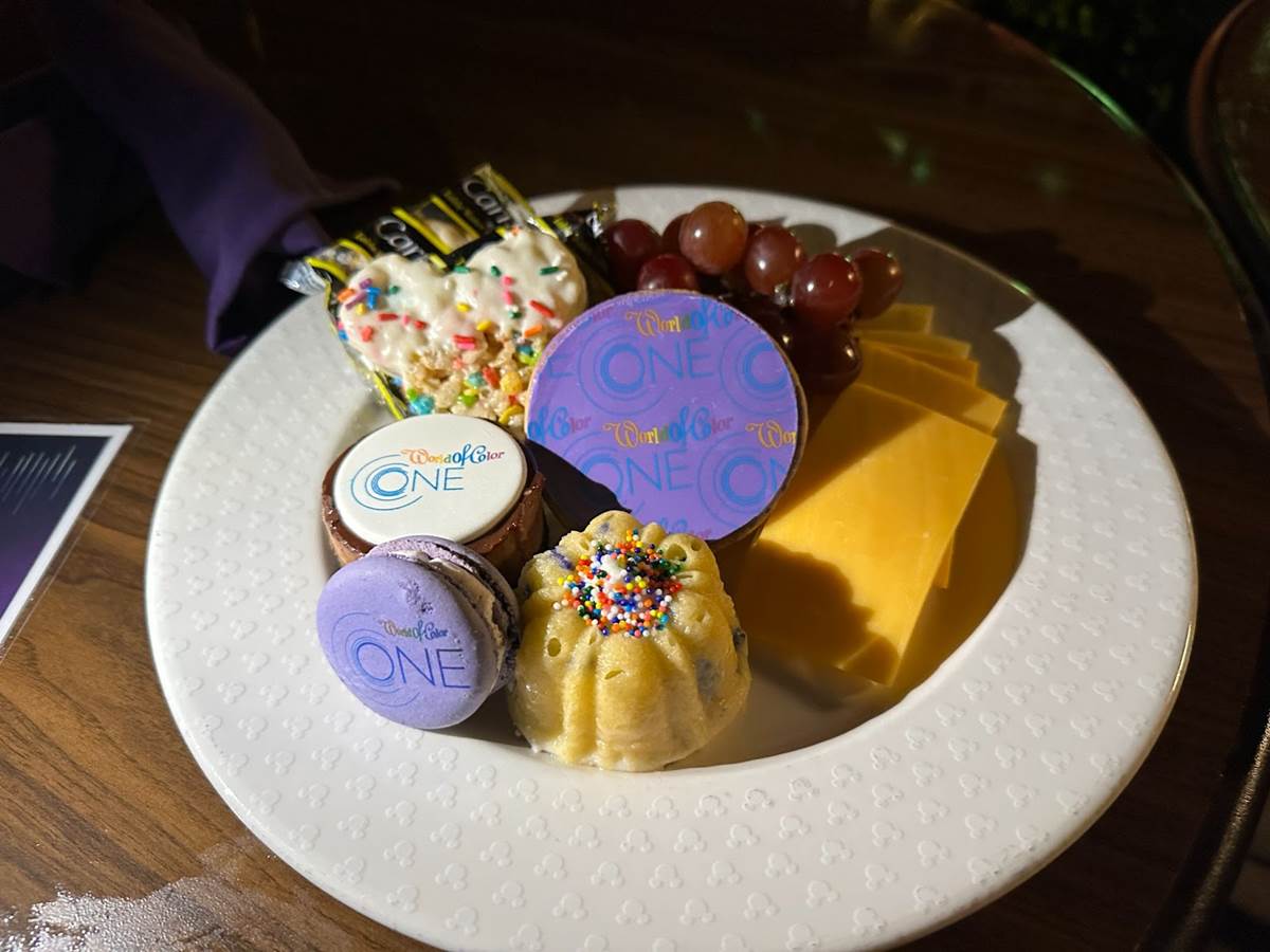 As a kiss goodnight, we were escorted to Paradise Gardens Park for a dessert party and viewing of World of Color - ONE. With comfortable chairs at tables facing the pier, we snacked on tasty sweets while enjoying themed beverages.