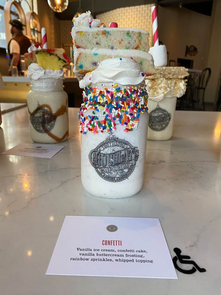 - Confetti: “Vanilla ice cream, confetti cake, vanilla buttercream frosting, rainbow sprinkles, whipped topping"