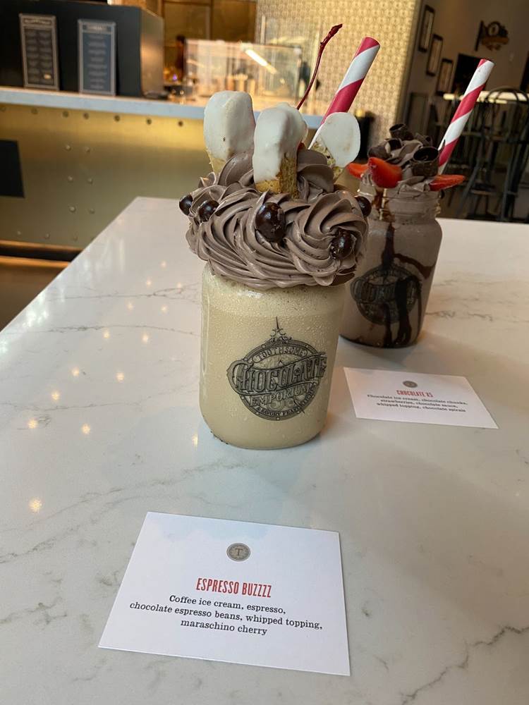 - Espresso Buzzzz: “Coffee ice cream, espresso, chocolate espresso beans, whipped topping, maraschino cherry"