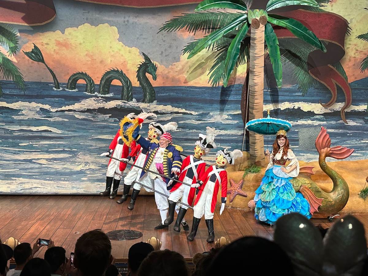 Our next stop was the stunt show Eye of the Storm: Captain Jack’s Stunt Spectacular. Our group was brought into the preshow first, where Head of Entertainment Steve Brown, and Creative Production Leader, Danny Newell, explained what we were about to see. The entire show is in Cantonese, but the Teatro Fandango was founded by Don Diego, who stars in every production they put on. The lobby is full of commissioned artwork depicting past performances of classic plays by the likes of William Shakespeare. But today, the troupe is debuting an original show based on the legend of Captain Jack Sparrow, who has allegedly hidden treasure in this very theater.