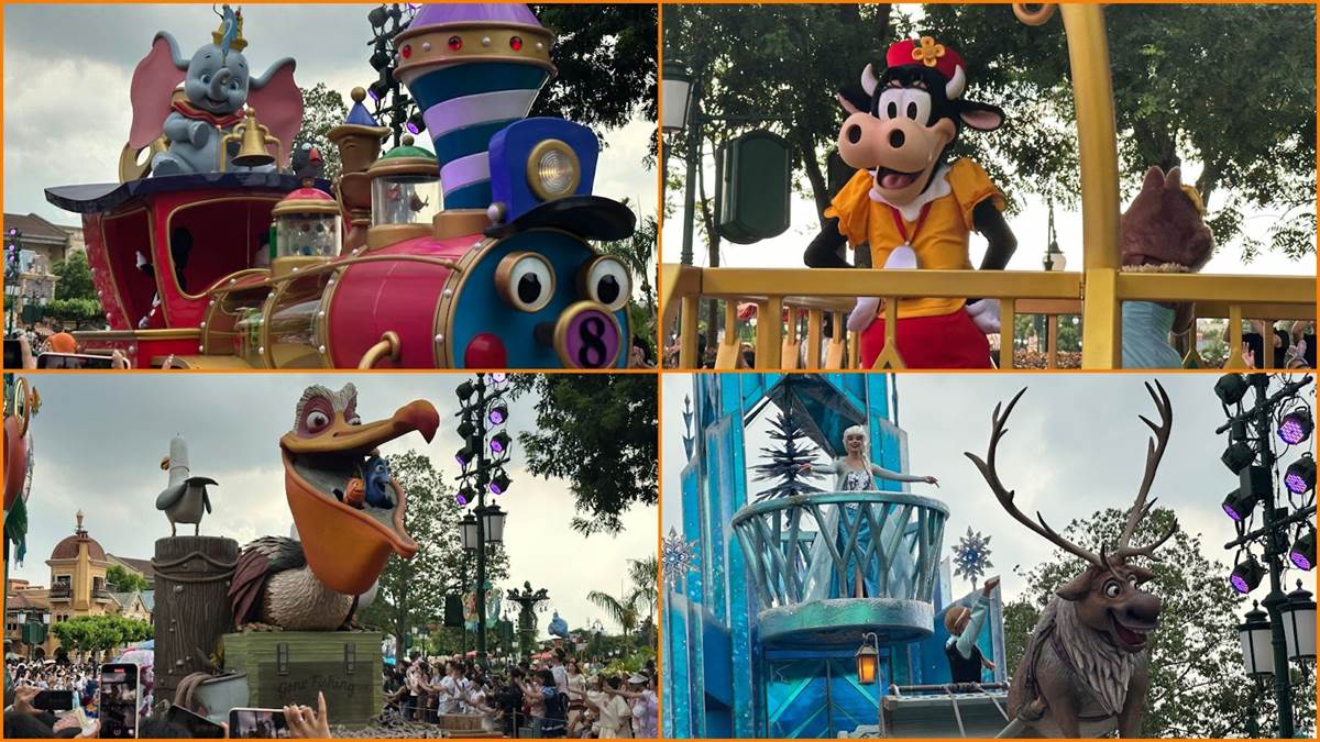 The train-themed parade used the song “Casey Jr" from Dumbo to connect floats themed to Toy Story, Tangled, Finding Nemo, Frozen, and Aladdin.