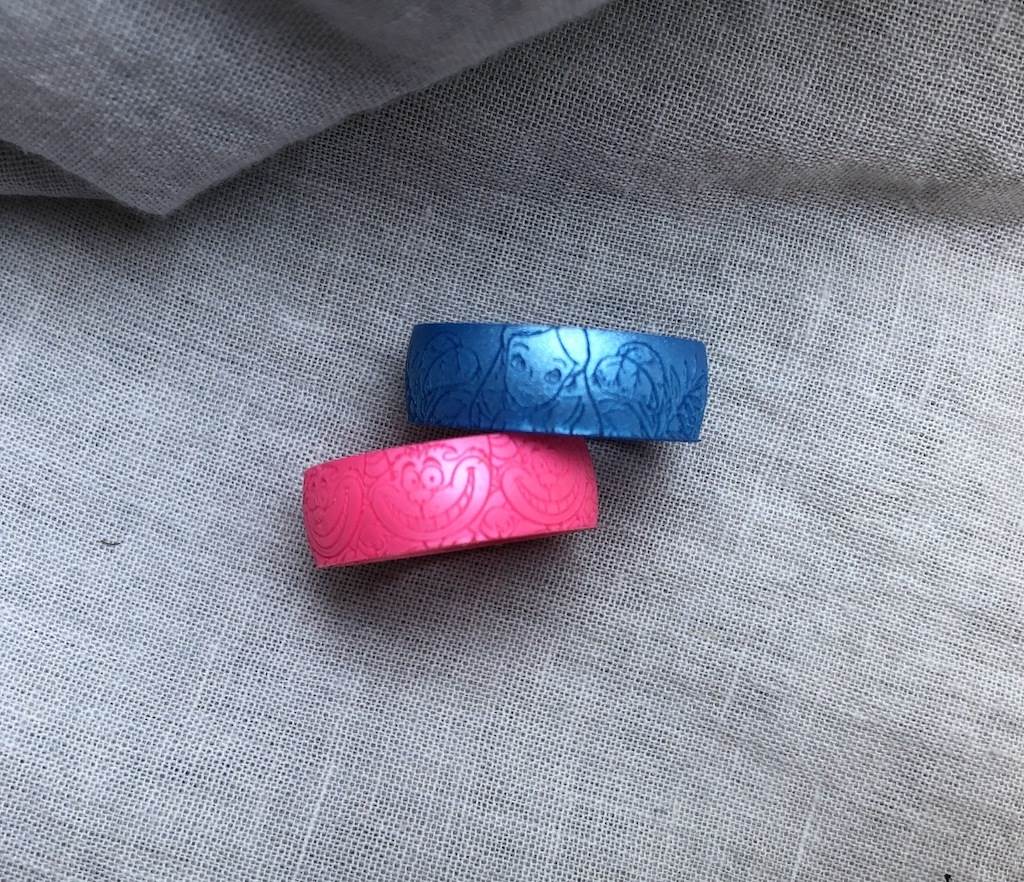 This month, Enso Rings took a trip down the rabbit hole with Alice in Wonderland! The titular character stars on her very own bright blue ring that’s nearly identical in color to her on-screen dress. For this collection she’s joined by the Cheshire Cat who’s all smiles on his own neon pink ring.