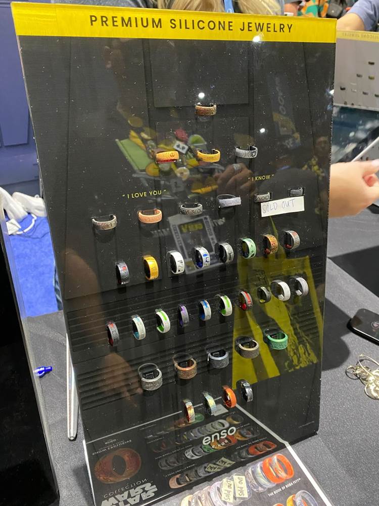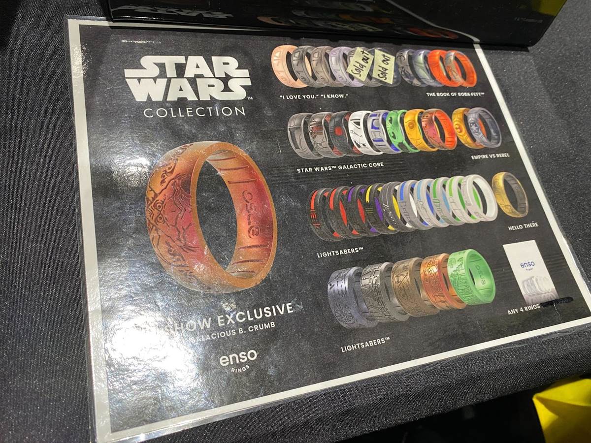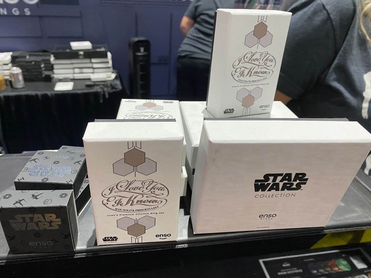 Wambold: For sure our ‘I love you, I know’ collection. We created ‘I love you, I know’ in Aurebesh, and we have one ring that says ‘I love you’ [and] one ring that says ‘I know.’ And two of them in ‘I know’ have already sold out at the show, which is really awesome. We have a beautiful collection box that they come in, and we do offer a discount when you buy the collection set. [And] everything’s available on the website. Those have just been flying off [the shelves here]. And our other ring that has been doing really well is our Darth Vader ring. He’s in our dual-tone black and red… absolutely stunning looking. And then we have a bunch of lightsaber rings, we have our Book of Boba Fett collection, Empire vs. Rebel, and another fan favorite has been ‘Hello there.’ It has Obi-Wan on one side and General Grievous on the other, so it’s a really, really fun ring.