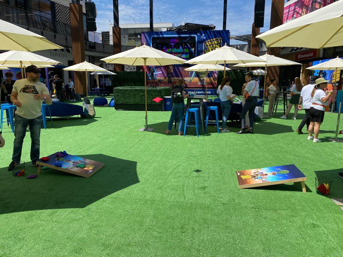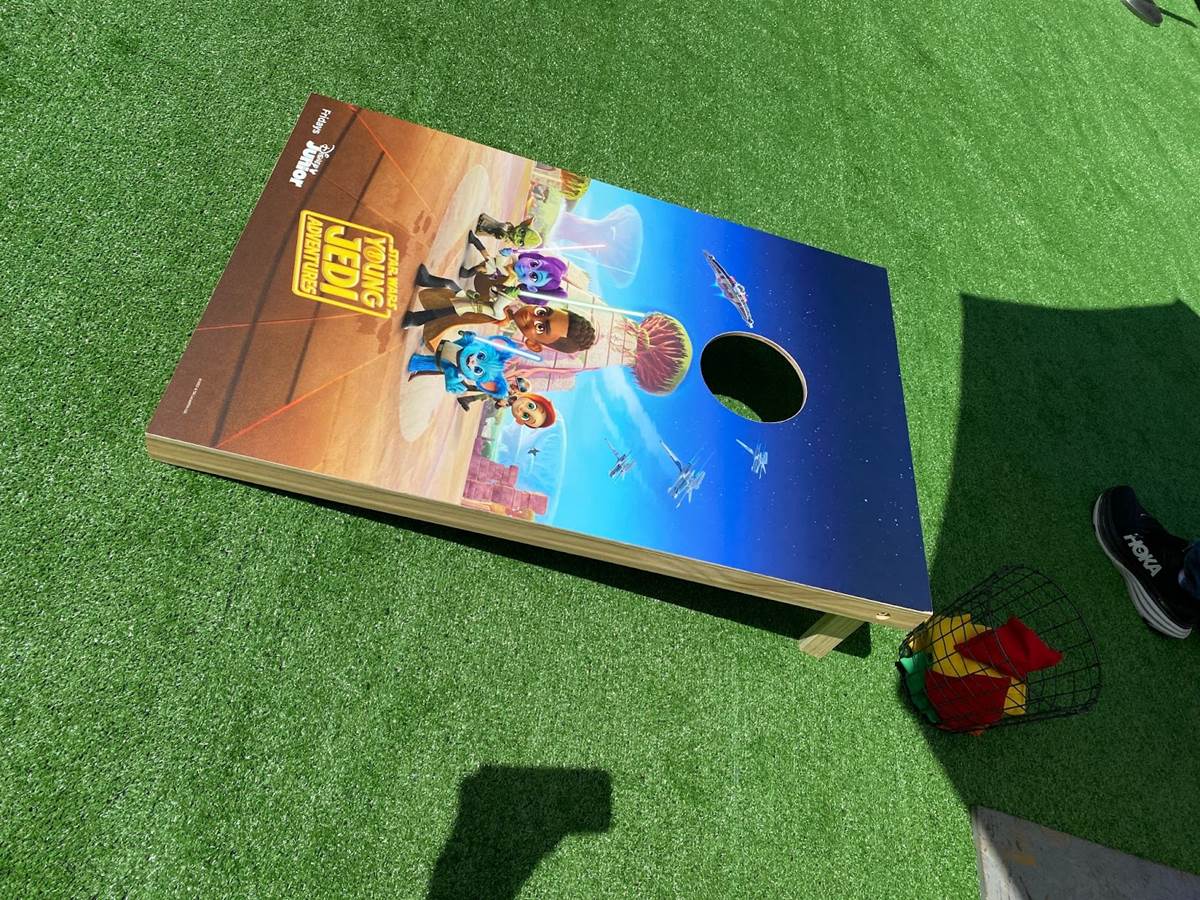 And in the extensive photo gallery below, you can get a closer, more detailed look at the Star Wars: Young Jedi Adventures Family Field Day area’s setup and layout, plus the show stage, the kid-friendly obstacle course, the food and beverage stands with special themed menus for the occasion, a Young Jedi Adventures photo op that will seem very familiar to anyone who has visited the Downtown Disney District in recent months, a thorough merchandise display showing off all the tie-in toys and apparel from the show, a Star Wars: Young Jedi Adventures cornhole game, and a spin-to-win wheel for younglings. There were also shaded rest areas where guests could relax and keep themselves shielded from the hot Southern California sun. Westfield Century City described the one-day event as follows: “To celebrate Star Wars: Young Jedi Adventures, the first animated series set during the High Republic era, we are hosting a Family Field Day! You and your Younglings are invited to join us in exploring the galaxy and starting your paths to becoming a Jedi Knight!"