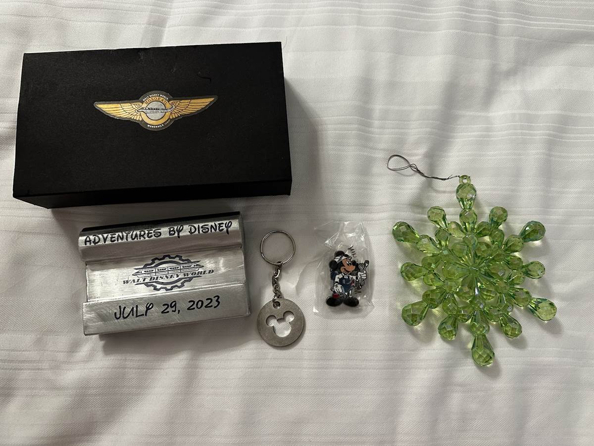In addition to the ornament from Holiday Services, Central Shops gave us a pin and a laser-cut keychain, and the Monorail Workshop gave us an engraved piece of busbar, the metallic strip that provides power to the monorail.