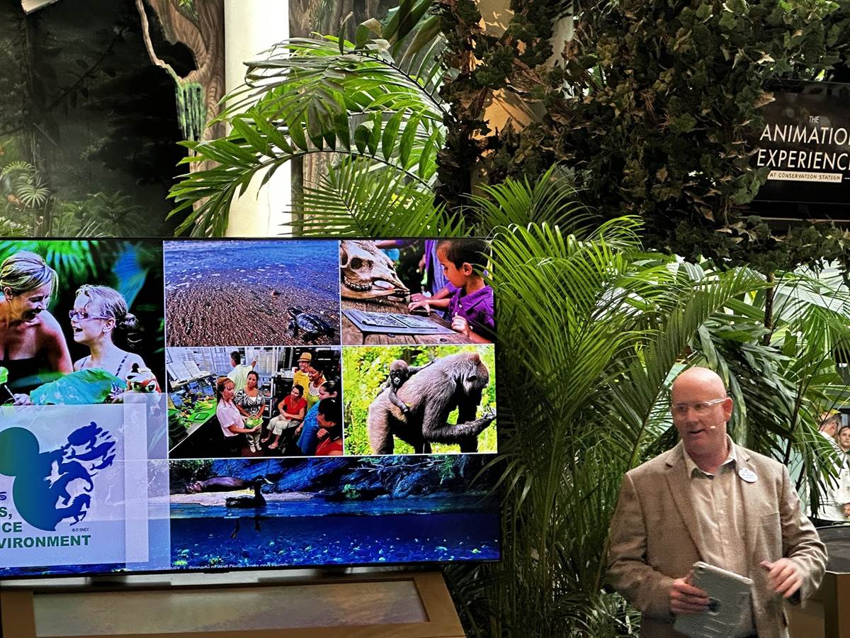 Dr. Mark Penning was the advertised guest speaker, but he was held up by international travel. In his place was Dr. Scott Terrell, Director of Animal and Science Operations. He leads a team of nearly 900 people who look after the animals at Disney’s Animal Kingdom, Disney’s Animal Kingdom Lodge, Tri-Circle D Ranch, The Living Seas, Aulani, Castaway Cay, Disneyland, and Vero Beach. The previous day, several of Dr. Scott’s team members went to Vero Beach to assist with the release of 2 baby turtles, and he shared they’ve had a record-breaking year so far with over 1 million hatchlings. He touched on the environmental goals of the Walt Disney World Resort, which is currently around 40% operated by solar power, and nearly 100% of seafood served on property is sustainably managed. At Animal Kingdom, they’re working with Restaurantosaurus to be the first restaurant that’s completely compostable. And Disney’s Fort Wilderness Resort and Campground is home to a glass digester machine that turns glass bottles back into sand, which can be used for beach renourishment. Some Cast Member costumes on property are also being made from recycled plastics.