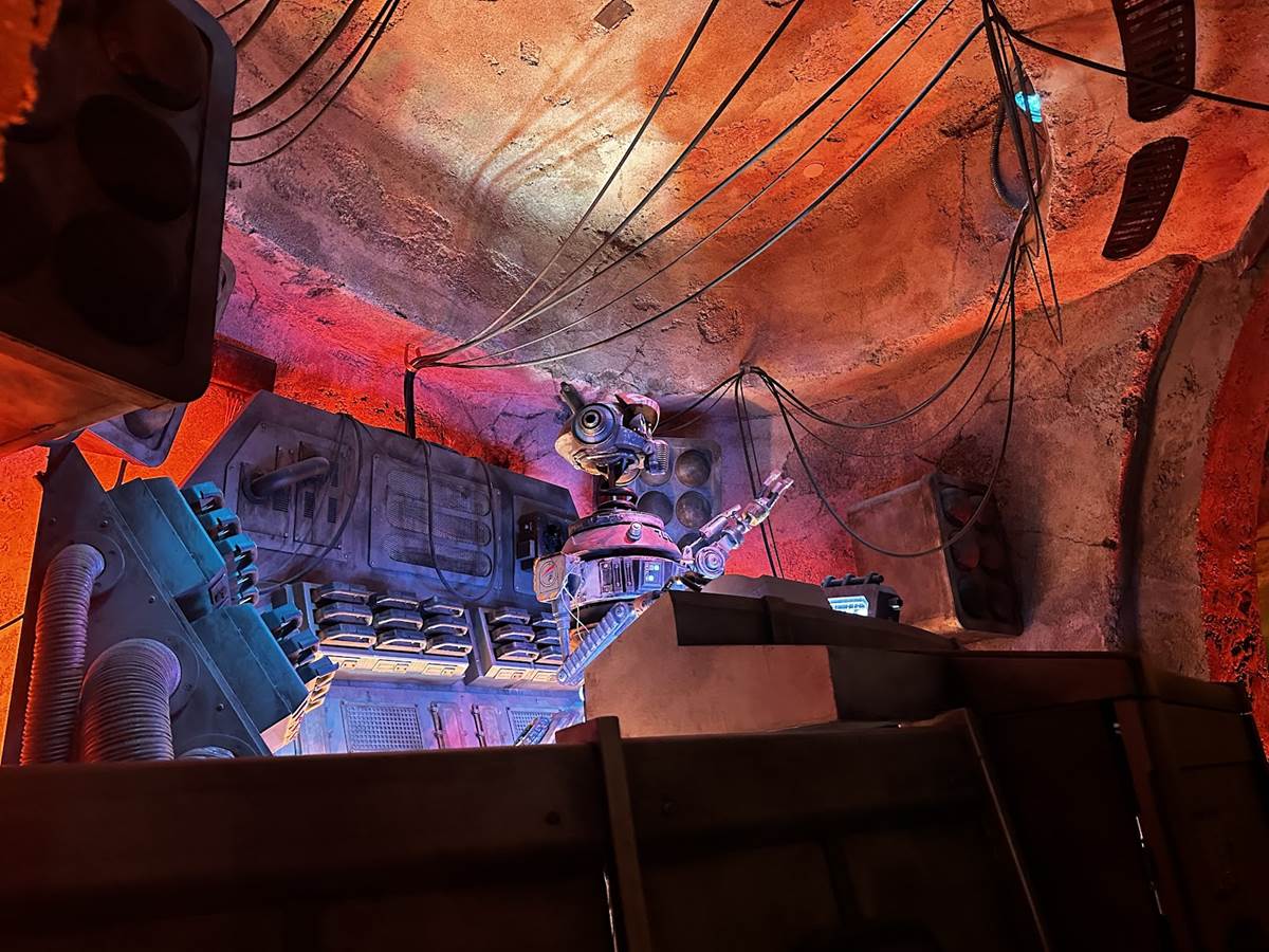 After lunch, our VIP Guides from the previous day were waiting to start our next adventure. Our guide, Shane, drove us to Disney’s Hollywood Studios, where we parked backstage at Star Wars: Galaxy’s Edge for a very special experience. We were taken backstage of Millennium Falcon: Smuggler’s Run to see one of 2 pods for Guests with mobility challenges in action. It allows for a longer load time than the typical rotating pods while still offering the same experience, with the asteroid scene included on all journeys (you only see it on the regular pods if there’s a delay). These pods are on hydraulic lifts and a rolling track that slides them into the screened dome after boarding is complete. After seeing backstage, we got to experience the attraction ourselves.