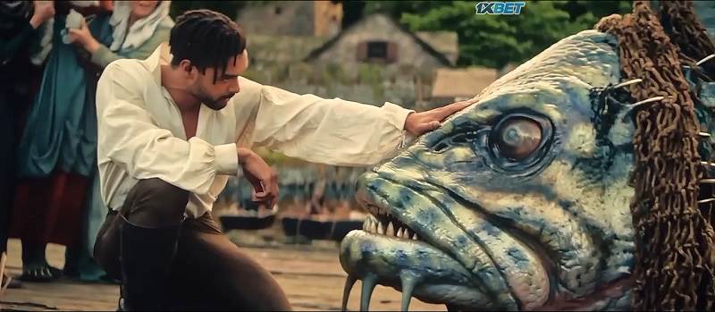 A strong focus was put on a giant fish character that they wanted to keep true to the lore of the story, but also show off the heroic nature of Xenk, played by Rege-Jean Page. In the sequence, he saves a baby from the mouth of the creature. While the creature was a practical effect, a lot of the emotion conveyed by the creature was digitally enhanced for a better performance, though the mouth, eyes, and fish itself were controlled on set, live.