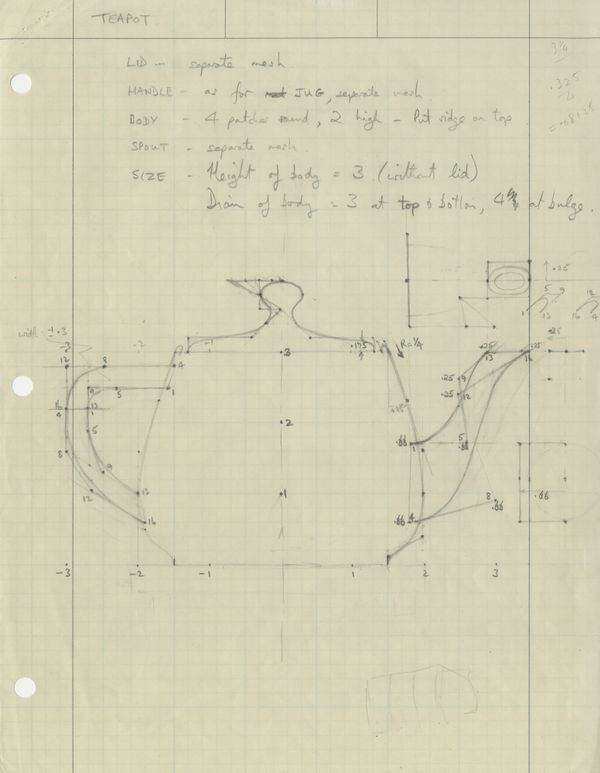 Newell’s wife, Sandra Newell, was the one who actually suggested modeling their tea set since they were sitting down for tea at the time. He sketched the teapot free-hand, and later took to the computer.