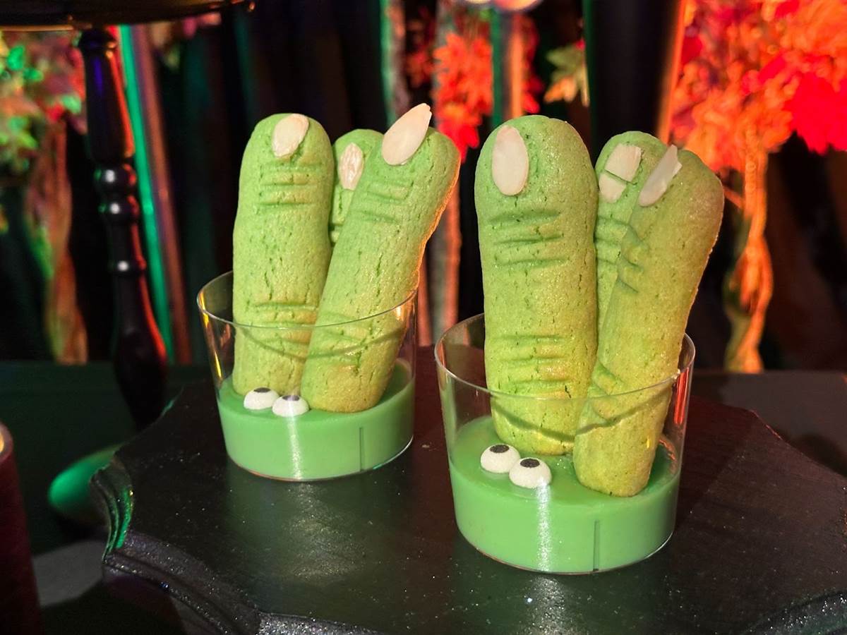 If the Zom-Beatz Bash in Tomorrowland has you dragging your feet, pop into Cosmic Ray’s Starlight Café for some Zombie Fingers! These almond cookie fingers are served in a jar of Key lime pie white chocolate ganache with salted caramel crisp pearls, and sugar eyes.