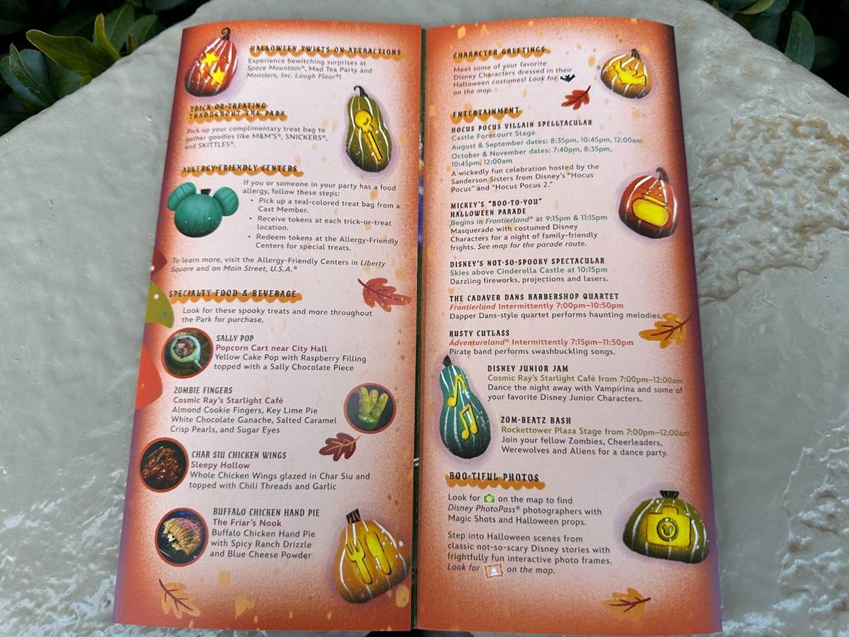 The inner fold shows event highlights, including Halloween twists on three attractions: Space Mountain, Mad Tea Party, and Monsters, Inc. Laugh Floor. Guests with allergy sensitivities are instructed to pick up a teal treat bag, which allows them to collect tokens at treat trails that can be exchanged for alternate treats. Guests will find information about specialty food and beverage offerings, with more available in this year’s Event Foodie Guide. And it also promotes special Disney PhotoPass Magic Shots, which you can learn more about here.