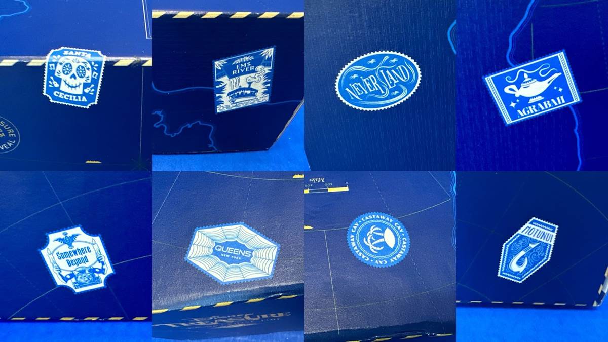The exterior of the box was covered in stamps. And not just any stamps, but ones from far-off exciting places. Disney’s private Caribbean island, Castaway Cay, is among them. But the majority are ones that come from the realm of make-believe, be it a theme park attraction, classic film, or comic book character.