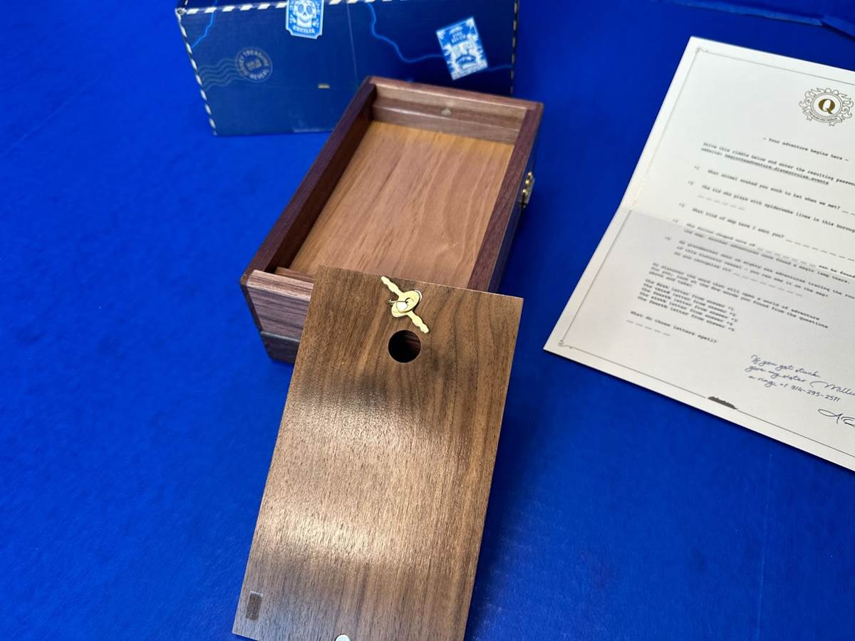 Back to the letter, the backside contained a puzzle that needed to be solved in order to gain access to a website. The answers to the questions were all in the letter, and the instructions at the bottom spell out “HEART." Entering that into the web address provided took us to a video greeting from Arthur Quinn, who was interrupted by his grandmother that he can’t give any more details away. If you want to see the video and more of this treasure chest, check out our unboxing video below.