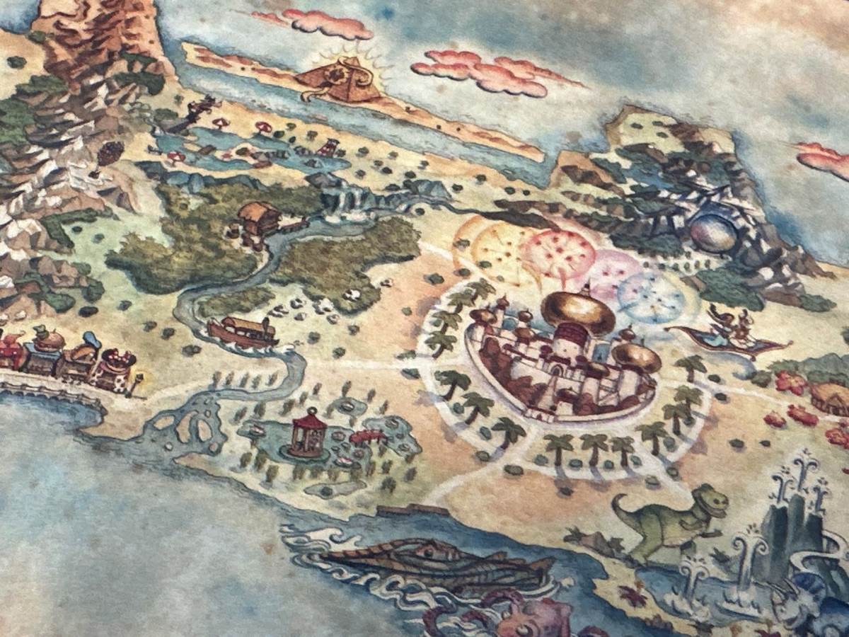 You’ll notice that the map is shaped like a Disney Cruise Line vessel. So far, all we really know is that the ship will be called the Disney Treasure, the characters on the back will be Captain Hook and Peter Pan, and that the atrium contains a statue of Aladdin and Jasmine riding the Magic Carpet. With that as our guide, let’s start exploring from the center. It’s very clear that the Palace of Agrabah symbolizes that central hub of the ship. Above it is Spaceship Earth nestled within a mountain range that could suggest the Matterhorn Bobsleds or Expedition Everest. It’s not that out of the question when you consider that to the left of Agrabah is what appears to be The Jungle Cruise. Above that, you see Goofy playing lifeguard near a pyramid that appears to have a slide coming out of it. If you follow the flow of the river down, you’ll also find what looks like food stands run by Mickey, Minnie, Goofy, Donald, and Daisy. Near there, it looks like there’s a tranquil Mulan-inspired wading pool, plus Rex and Trixie from Toy Story seem to be having a lot of fun near some geysers.