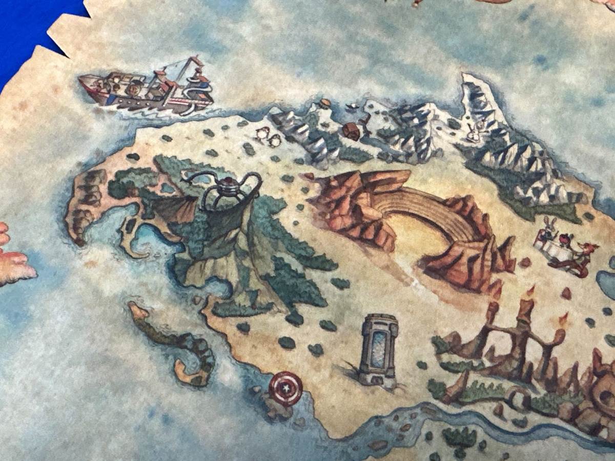 That curved rock ridge appears to have stadium seating, likely a nod to the ship's theater. The presence of porgs nearby suggests we’ve possibly entered the realm of youth activities. On the Disney Wish, the best place to find porgs is in the Star Wars Cargo Bay. There’s also one of Syndrome’s Omnidroids from The Incredibles, which is a themed obstacle course in the Hero Zone aboard the Disney Wish. And that island just off the aft of the ship looks a lot like Maui’s hook from Moana, with Motunui one of the stamps on the box.