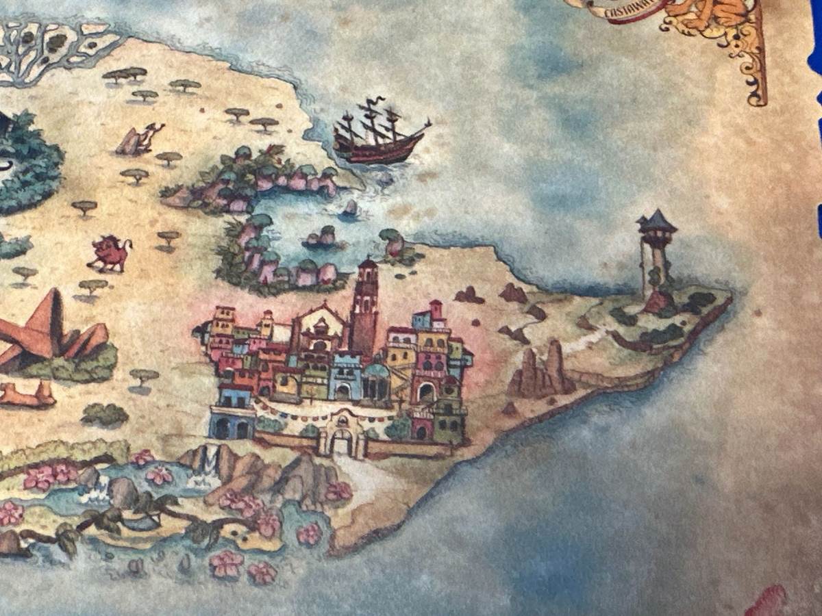 Heading back to mid-island, just before another dividing line of mountains, there’s another Moana reference, with Hei Hei near a hut. Could this be a lounge? Above that, it looks like a teapot and teacup from Alice in Wonderland, possibly a nod to the Wonderland Theater, one of two movie theaters aboard the Disney Wish. Just over the mountain pass is an X-Wing that has landed, implying there will be a Star Wars: Hyperspace Lounge on board. At the southernmost point of the range is the Cave of Wonders from Aladdin. Could this be the theme of the adjacent lounge, the Disney Treasure’s equivalent of Nightingales?