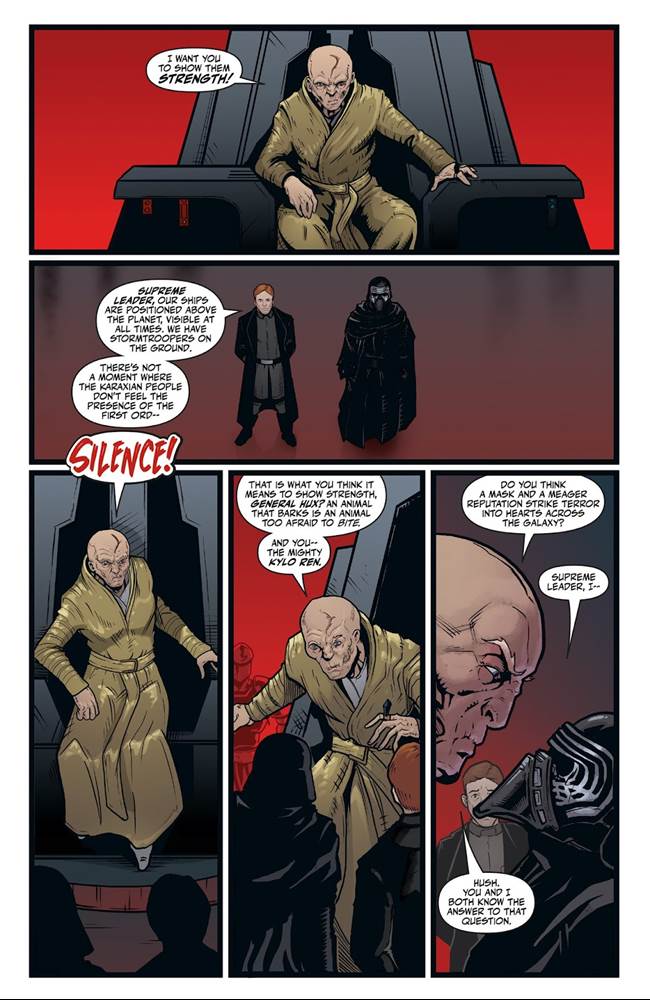 After a shaky start at the end of last year, Dark Horse’s Star Wars: Hyperspace Stories has been on a roll for the last few issues. That trend continued today with the release of issue #8 which focuses on the sequel-trilogy characters of Kylo Ren and General Hux sometime before the events of Star Wars: The Last Jedi. This adventure begins with Supreme Leader Snoke (still alive and in one piece at this point in the timeline) ordering his two favorite underlings– who famously do not get along very well with each other– to travel to the planet Karaxis (newly introduced here) and bring its resistant populace more firmly under the control of the First Order. Now say what you will about the recent Star Wars sequels, but the love-to-hate-them relationship between Ren and Hux has got to be one of their more entertaining aspects, so it’s a hoot to see them go at it again in these pages. It also helps that writer Michael Moreci (Star Wars Adventures) does a great job right off the bat of capturing these characters’ voices– I can almost hear actor Domhnall Gleeson barking his sniveling commands.