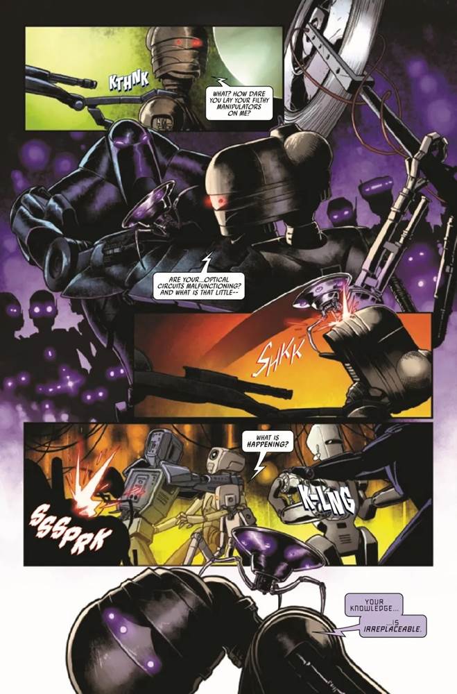 Star Wars (2020) #38 opens in Jabba’s Palace on Tatooine, where the ancient “Talky" translator droid is set to be disintegrated for “making a simple mistake" during one of the Hutt’s transactions. But little does the torturer droid EV-9D9 know that many of his compatriots have been taken over by the evil artificial intelligence known as the Scourge, and they quickly put an end to the destruction. The Talky manages to escape the chaos and melt down a good number of the possessed droids, enlisting a couple hapless Gamorrean Guards in his protection. Meanwhile, out in Tatooine’s Dune Sea, Lando Calrissian and his malfunctioning cyborg friend Lobot prepare to sneak into Jabba’s Palace by using disguises they find left over in the hold of the Millennium Falcon from the events of Solo: A Star Wars Story. We then get a three-page flashback to “years earlier," when the same pair of pals used (admittedly much classier-looking) disguises to gain access to a swanky nightclub as part of one of Lando’s cons. Back in the present (between The Empire Strikes Back and Return of the Jedi) on Tatooine, the two trick Jabba’s security droid into giving them access to the palace, only to find that it has been overrun by the Scourge.