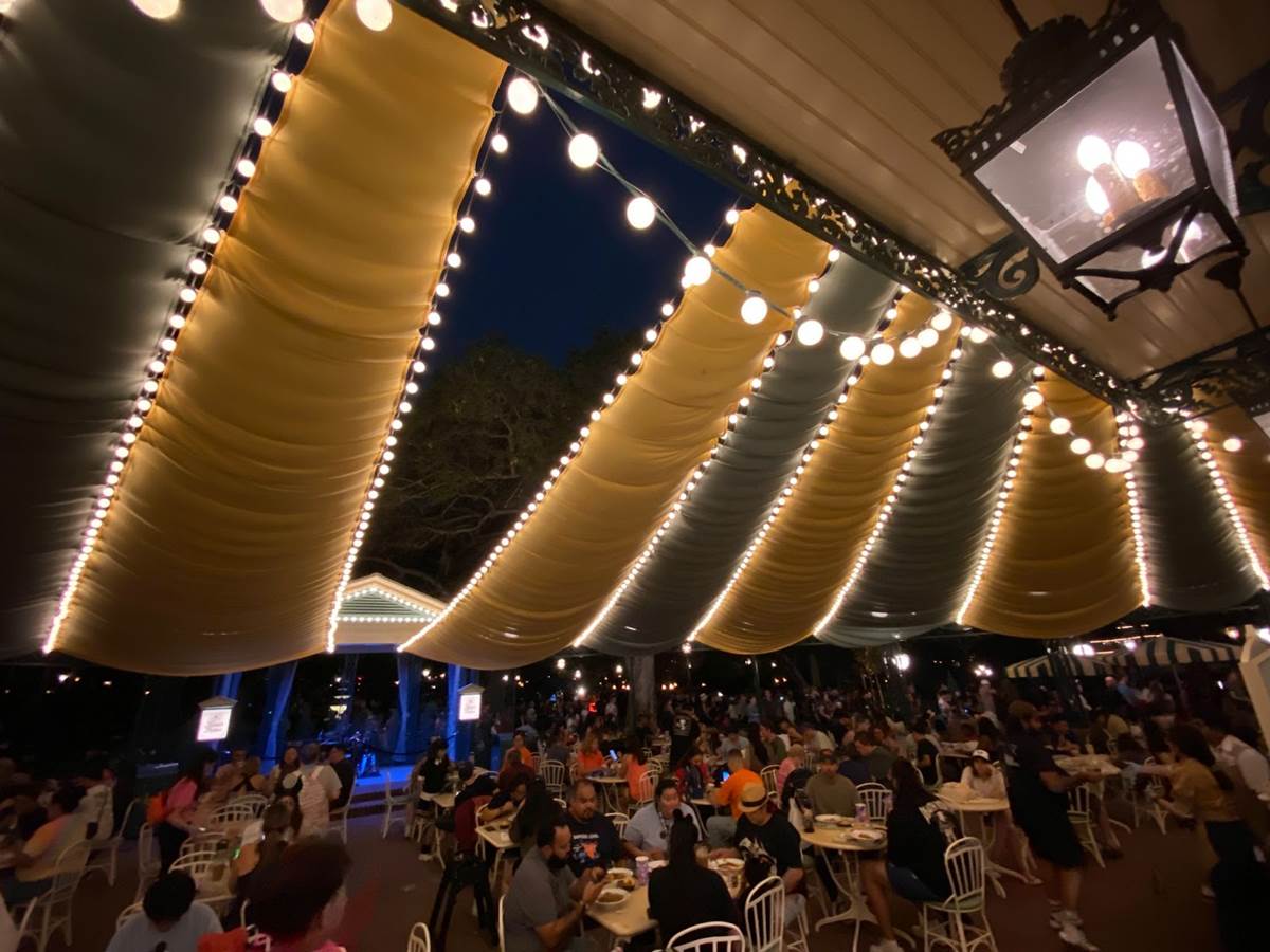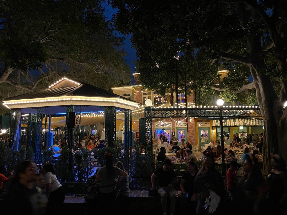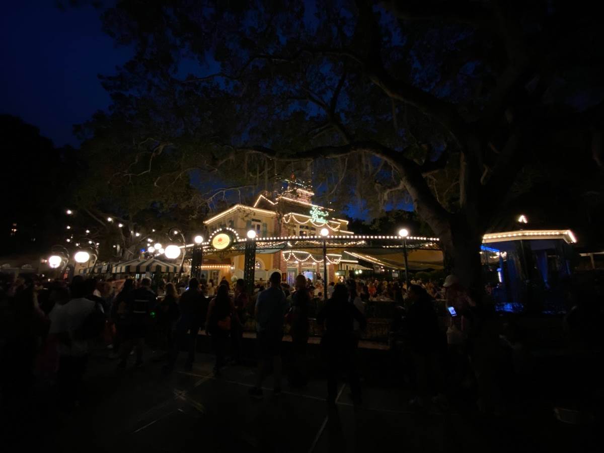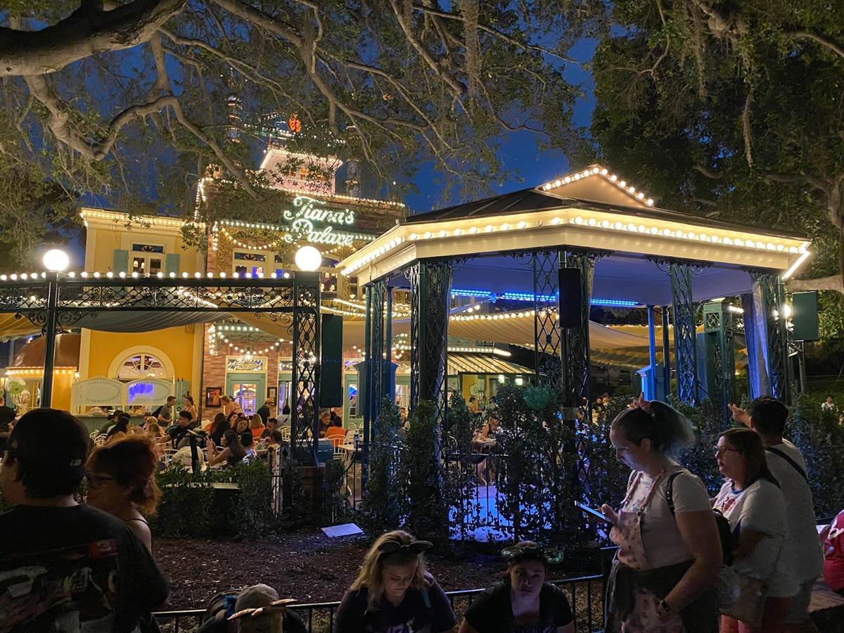 Finally nighttime rolled around and I was able to snap a bunch of photos of Tiana’s Palace in all its lit-up splendor, and it certainly looks great!