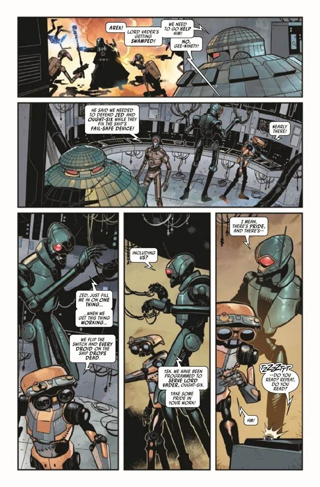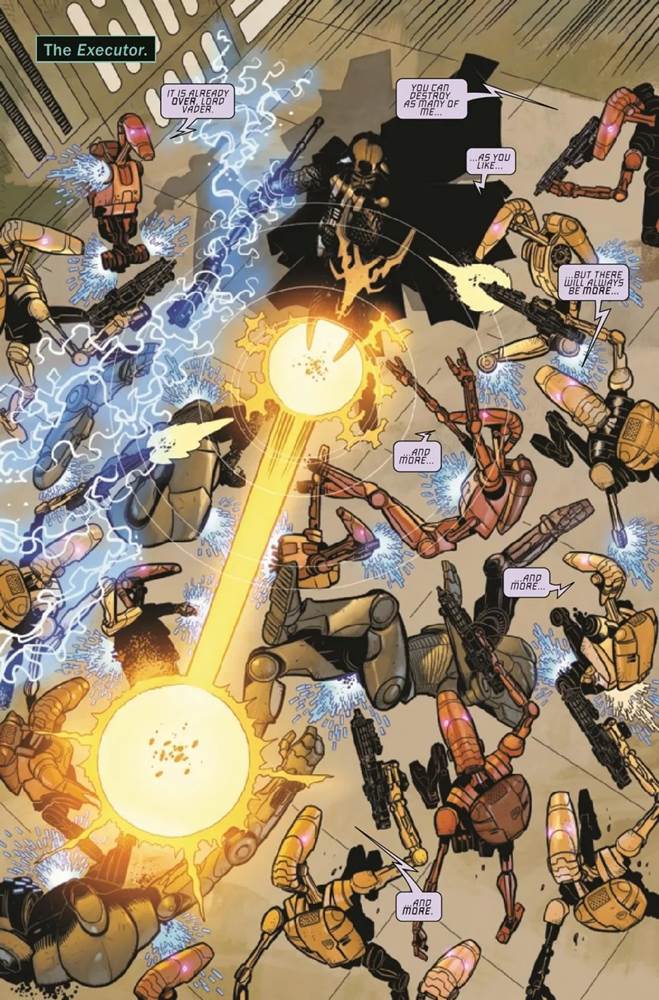 Darth Vader #38 begins with the titular Dark Lord of the Sith wiping out wave after wave of Scourge-infected battle droids aboard the Super Star Destroyer Executor. Meanwhile, Vader’s own droid assistants Zed and Ought-Six are attempting to override the flagship’s systems and reconfigure a kill-switch that can deactivate all the droids aboard the vessel, including themselves. As this is happening, five regular-sized Star Destroyers jump out of hyperspace around the Executor, there on the orders of Imperial Grand Vizier Mas Amedda to destroy Vader’s ship and everyone aboard, in an effort to prevent the Scourge virus from spreading even further among the Empire’s forces. But the admiral in charge of this fleet, a man named Corleque who has previously appeared only in the pages of this comic, once served under Admiral Piett, and decides to spare his former commander’s life by rescuing him before destroying the SSD. This proves to be a fatal mistake, as once Corleques infantrymen (and accompanying KX-series security droids) board the Executor, they are immediately overrun by the Dark Droids. Long story short, they bring the virus back to Corleque’s ship, while Vader’s droids manage to activate the kill switch.