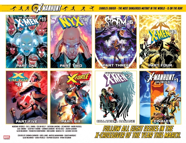- The eight-issue crossover, taking place throughout March releases, will be a part of all of the current ongoing X-Men related titles, including Uncanny X-Men, NYK, Storm, X-Men, X-Factor, X-Force and Exceptional X-Men, and then conclude in the X-Manhunt Omega double-sized one-shot.