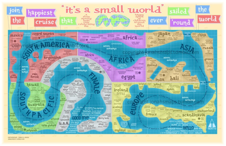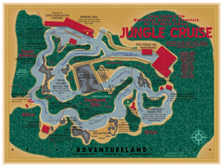 You probably don't spend much time thinking about maps, let alone designing one, or rather designing a map for something that already exists. Enter Jonah Adkins. This artist has created a map of both the Jungle Cruise and "it's a small world" attractions found at Disney Parks. At first glance, Adkins' designs are simple overhead views of the rides, then on closer inspection, we can see all the amazing detail to each map. Adkins has all of the names and locations of the animatronics in "it's a small world" and all of the skipper jokes in Jungle Cruise. Check it out: