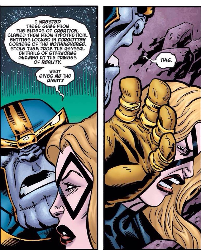And by the way, Thanos decimated our favorite heroes in far more gruesome and dramatic fashion in the comics. For example, he turned Wolverine’s adamantium skeleton into rubber, trapped Cyclops in a cube and suffocated him, turned Thor into glass and smashed him and so much more.