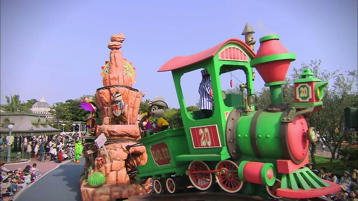 Next up, we had the Westernland’s floats, with Westernland being the park’s Frontierland. Big Thunder Mountain Railroad got its very own float in the parade with a giant railroad engine that had Chip and Dale battling it out as a cowboy and a Native American. The next part was a bit controversial as there were a lot of cast members dressed in Native American garb who very clearly were not Native American, so definitely not something that could be done today especially with some war chants they included. But after that, there was a very fun part with some cowboy boots tapping at the front and Woody, Jessie, and Clarabelle running around a saloon.